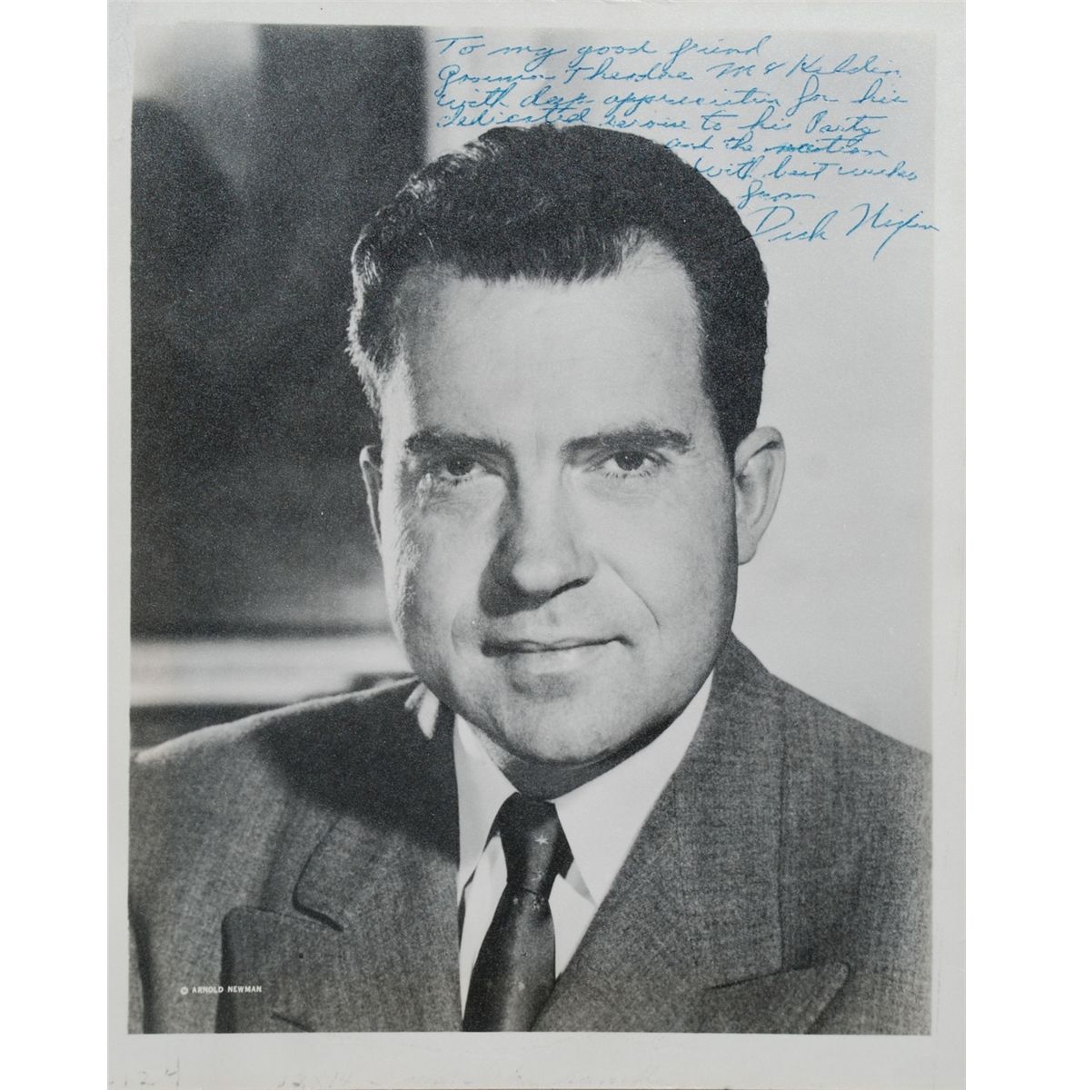 SP, matte finish on board, 10 x 8”. The long inscription is really an ANS. It reads “To my good friend Governor Theodore McKeldin with deep appreciation for his dedicated service to his Party and the nation with best wishes from Dick Nixon”. McKeldin, Governor of Maryland, made the principal speech nominating Dwight Eisenhower as the Republican candidate for President in 1951