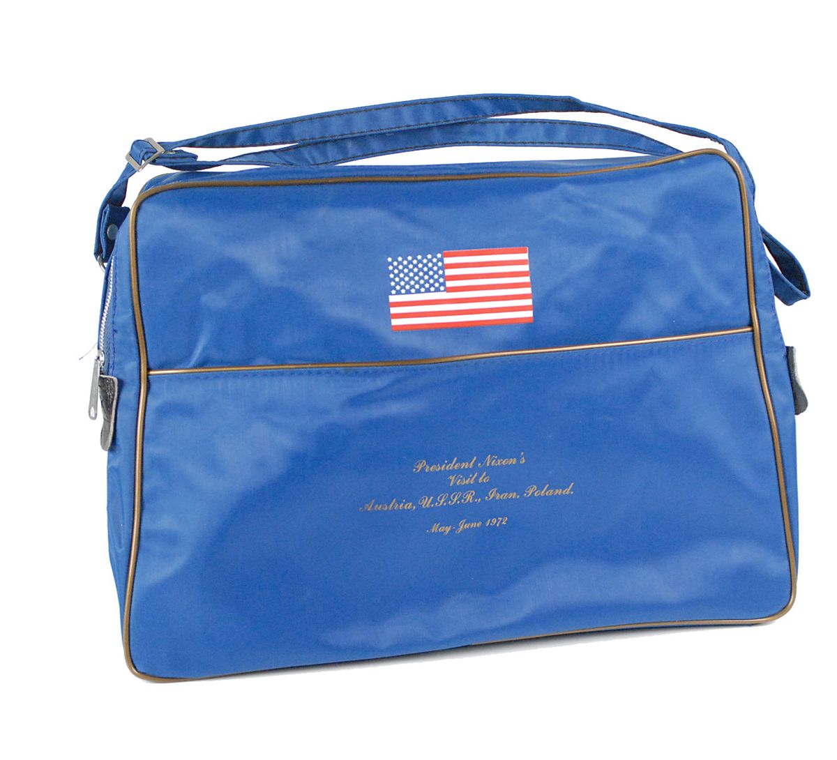 Unused souvenir travel bag which would have been given to a guest on Air Force One as a memento of their flight. The blue bag measures 16 x 11 and features an American flag screened on the side, as well as text in gold commemorating the specific trip: “President Nixon’s Visit to Austria, U.S.S.R., Iran, Poland, May–June 1972.” In fine condition. From the estate of Colonel Ralph Albertazzie, the pilot of Air Force One during the Nixon administration, who most notably flew the president on a historic trip to China.