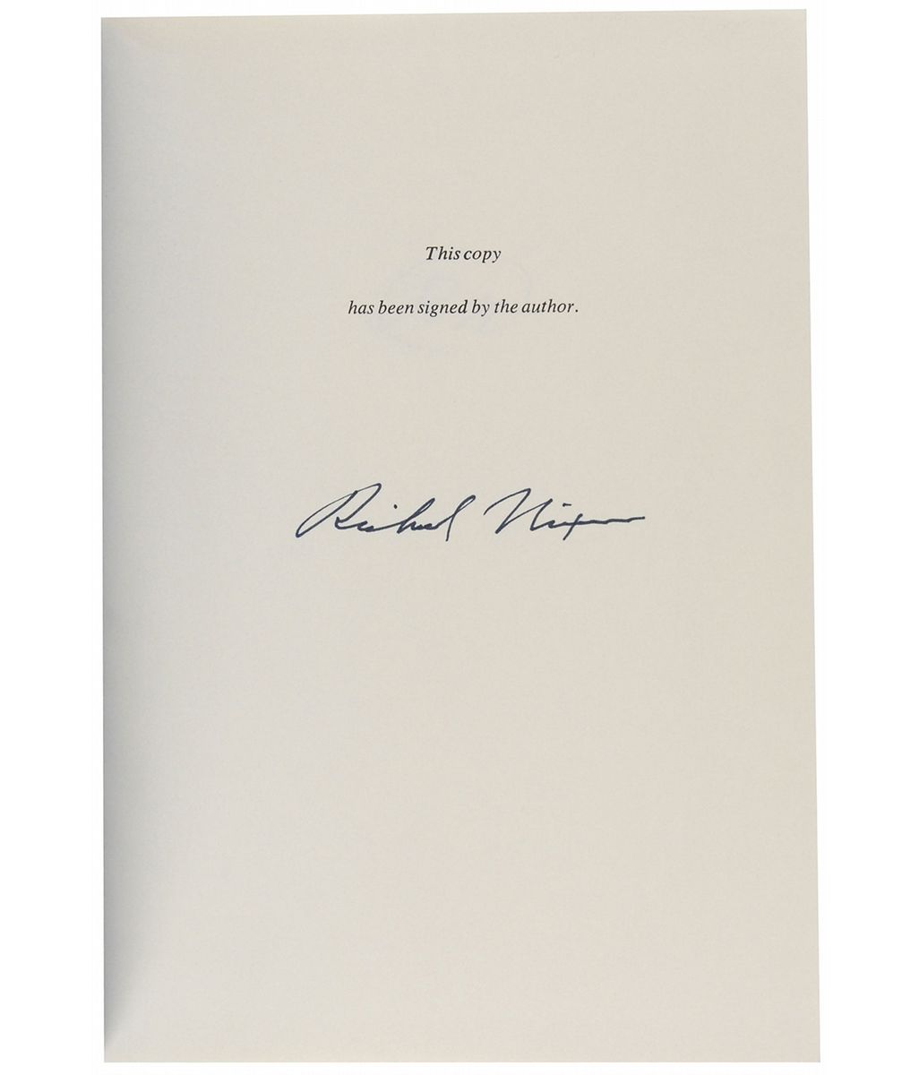 Signed book: The Memoirs of Richard Nixon. First edition, first printing. NY: Grosset & Dunlap, 1978. Hardcover with slipcase, 7.25 x 10, 1120 pages. Signed on the colophon in black felt tip. Sunning to spine and slipcase edges, otherwise fine condition.