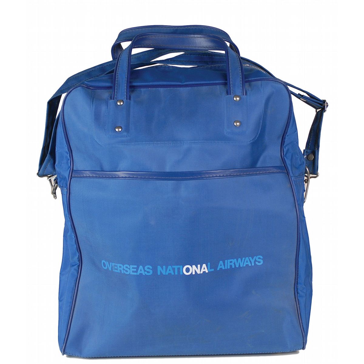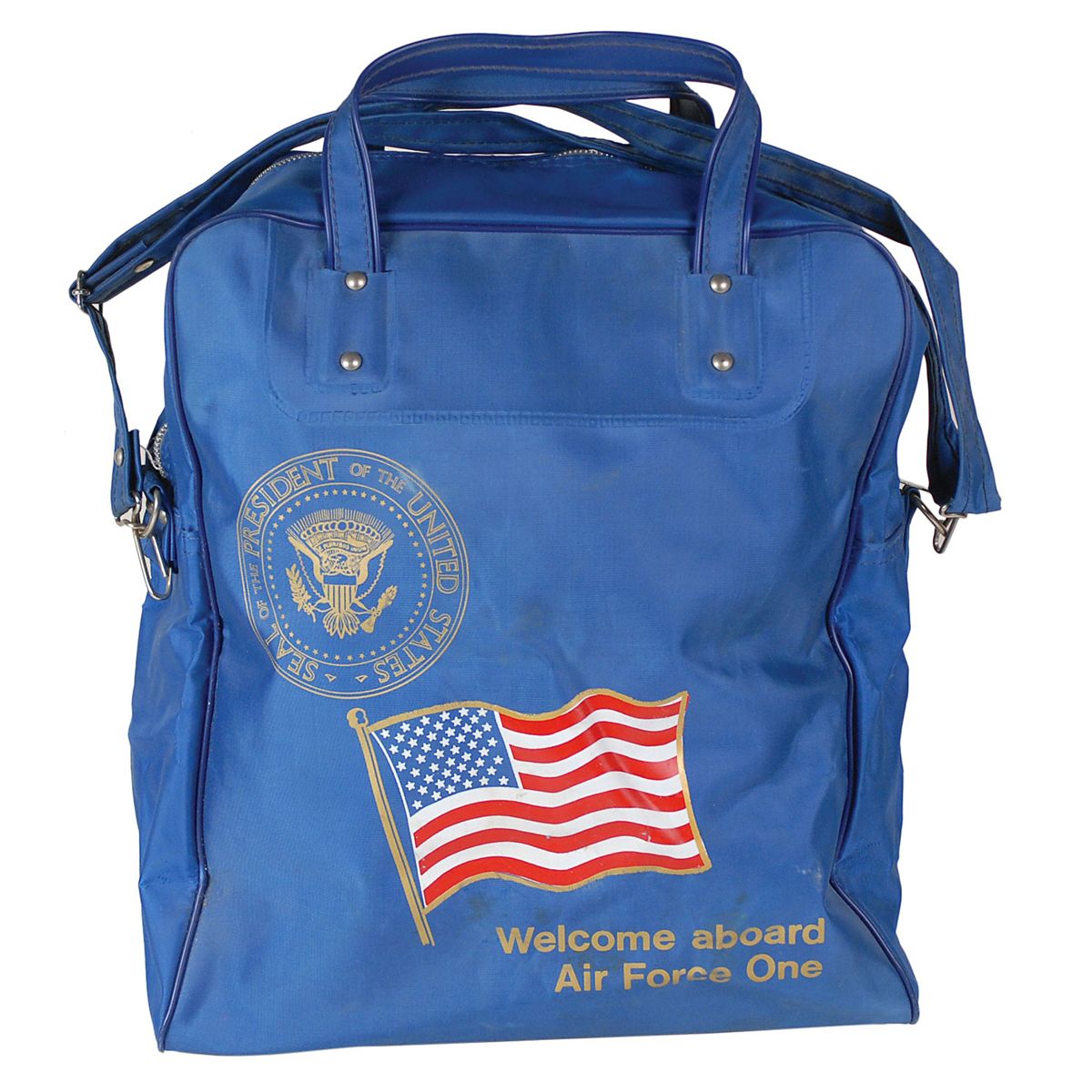 Unused souvenir travel bag which would have been given to a guest on Air Force One as a memento of their flight. The blue bag measures 12 x 14 and features an American flag and presidential seal screened on the side, as well as text in gold, reading: “Welcome aboard Air Force One.” The opposite side reads: “Overseas National Airways.” Some scattered soiling, otherwise fine condition. From the estate of Colonel Ralph Albertazzie, the pilot of Air Force One during the Nixon administration, who most notably flew the president on a historic trip to China.