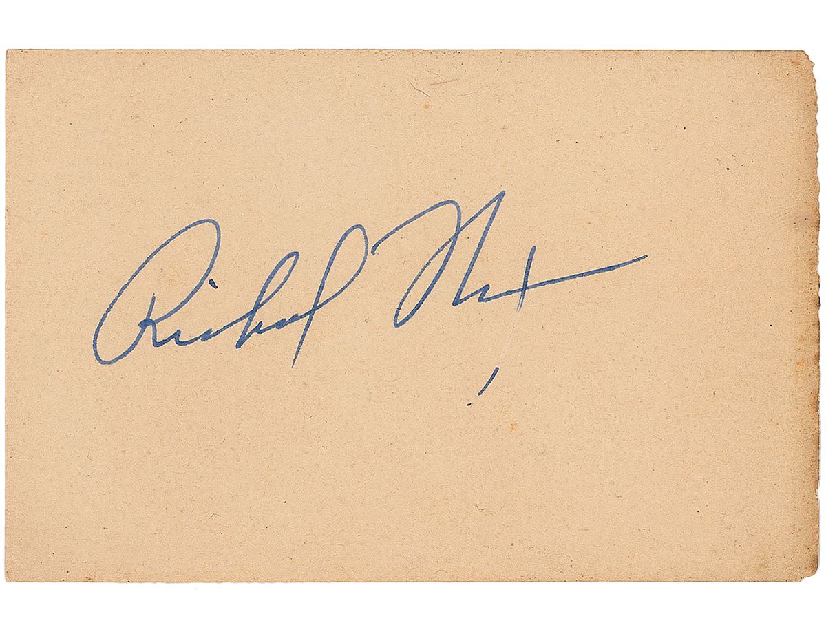 Ink signature, “Richard Nixon,” on an off-white 4.5 x 3 card. A rough and toned right edge, and skipping to last letter of the signature, otherwise fine condition.