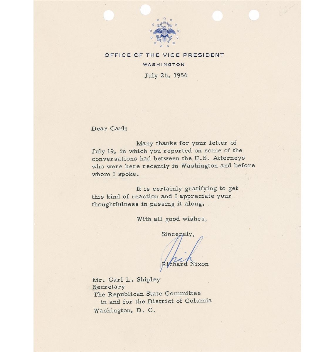 TLS signed “Dick,” one page, 6.75 x 9, Office of the Vice President letterhead, July 26, 1956. Letter to Carl Shipley, in full: “Many thanks for your letter of July 19, in which you reported on some of the conversations had between the U.S. Attorneys who were here recently in Washington and before whom I spoke. It is certainly gratifying to get this kind of reaction and I appreciate your thoughtfulness in passing it along.” In fine condition, with four punch holes to top edge.
