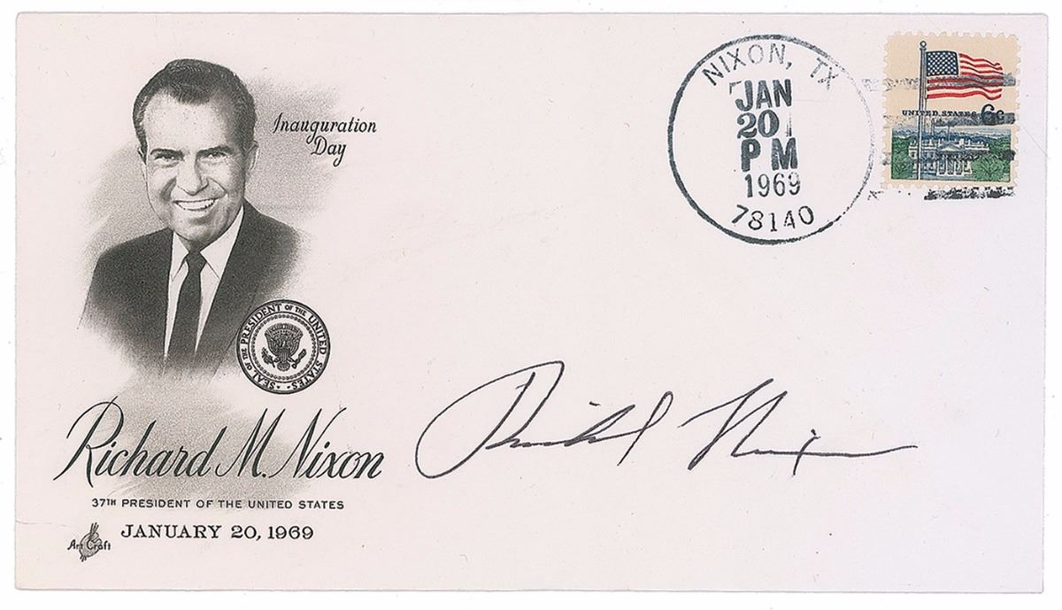 Commemorative cover with a cachet honoring the inauguration of President Nixon on January 20, 1969, signed in black felt tip. In very fine condition.