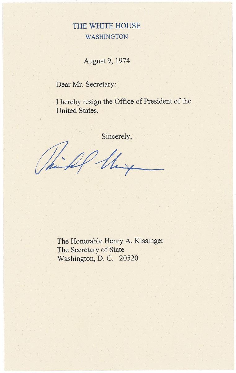 Souvenir typescript of his resignation letter on an off-white 5 x 8 sheet, signed in blue ink by Nixon. In full: “I hereby resign the Office of President of the United States.” In fine condition, with evenly trimmed edges.