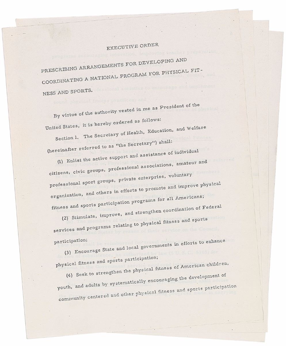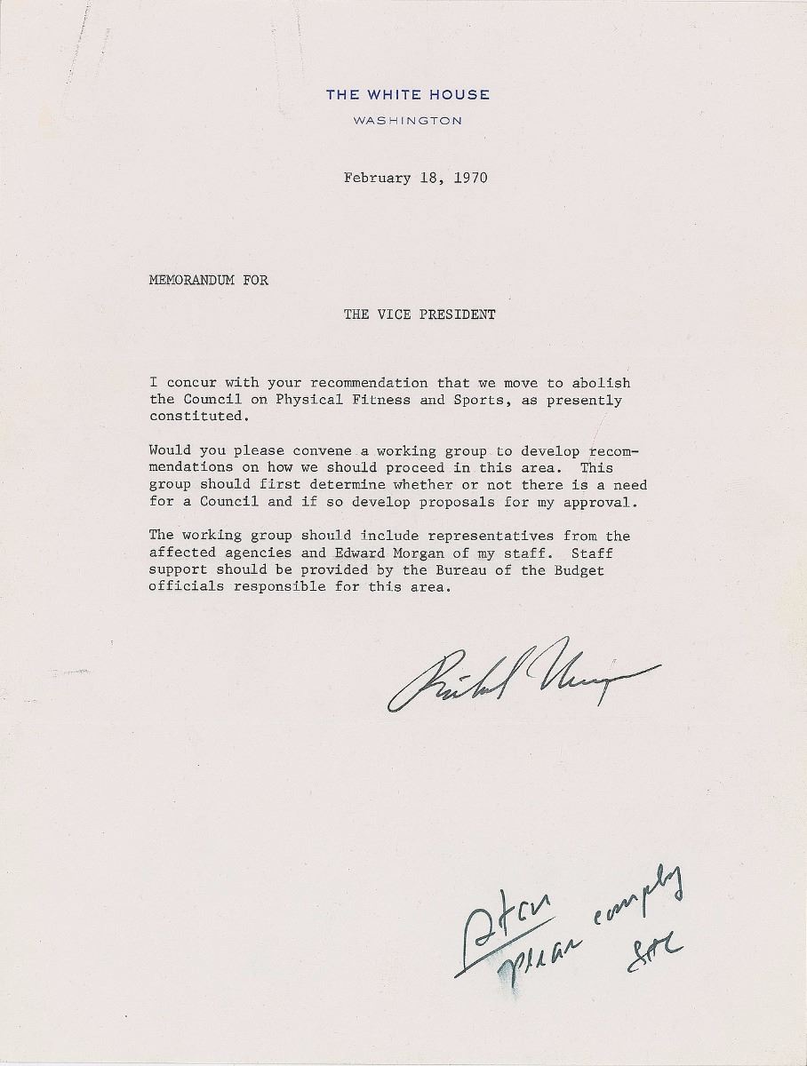 TLS as president, one page, 8 x 10.5, White House letterhead, February 18, 1970. Memo to Vice President Spiro T. Agnew. In part: “I concur with your recommendation that we move to abolish the Council on Physical Fitness and Sports, as presently constituted. Would you please convene a working group to develop recommendations on how we should proceed in this area.” A copy of President Nixon’s four-page executive order for “Prescribing Arrangements for Developing and Coordinating a National Program for Physical Fitness and Sports” is paperclipped to the letter. In fine condition. Originates from the personal estate of Spiro Agnew. The President's Council on Physical Fitness and Sports actually expanded under these special advisors, and in 1972 President Nixon established the Presidential Sports Award to encourage participation in physical activities.