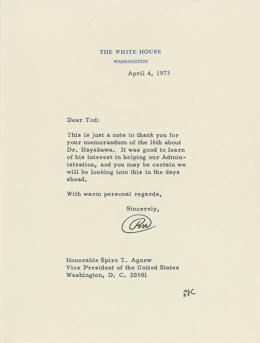 TLS as president signed “RN,” one page, 6.75 x 8.75, White House letterhead, April 4, 1972. Letter to Vice President Spiro T. Agnew. In full: “This is just a note to thank you for your memorandum of the 16th about Dr. Hayakawa. It was good to learn of his interest in helping our Administration, and you may be certain we will be looking into this in the days ahead.” In fine condition. Originates from the personal estate of Spiro Agnew. S. I. Hayakawa was a noted academic who later served as a Republican senator from California.