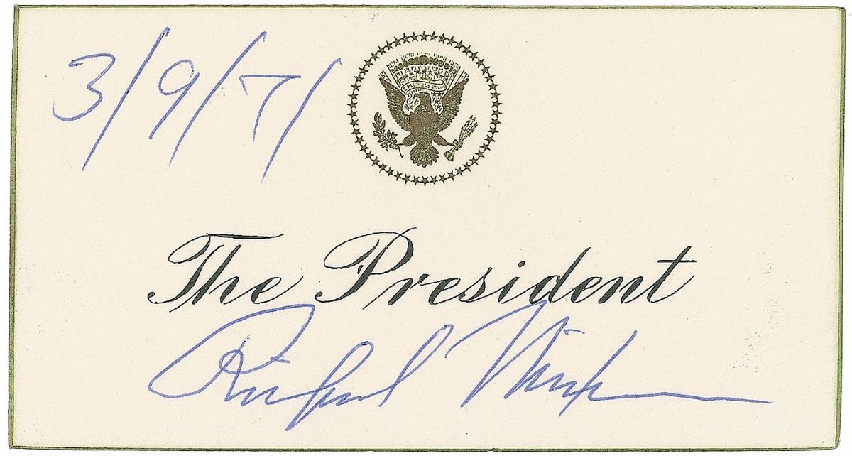 Official gilt-edged placecard featuring an embossed presidential seal and calligraphic label “The President,” 4 x 2.25, signed in blue ballpoint, “Richard Nixon, 3/9/71.” In fine condition. Originates from the personal estate of Spiro Agnew. As White House cards signed by Nixon are virtually nonexistent, this example serves as a fine substitute and is especially desirable given its provenance.