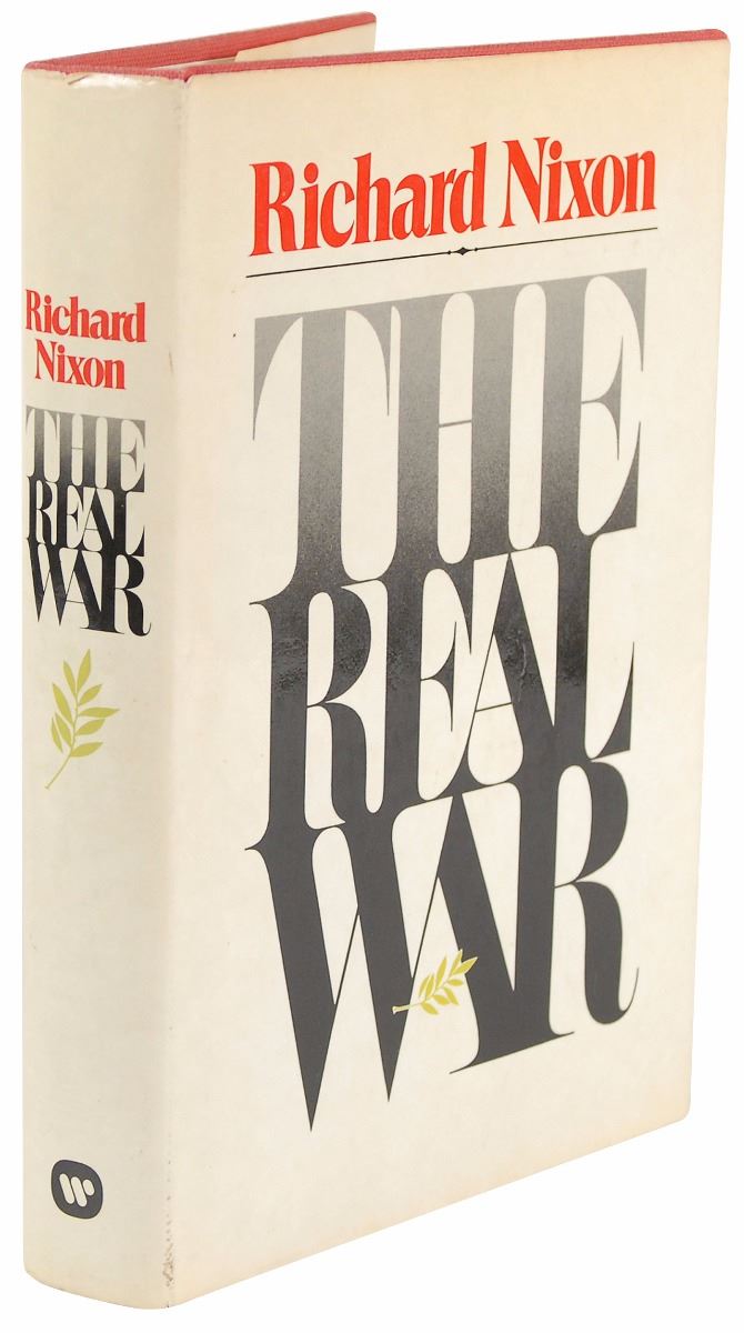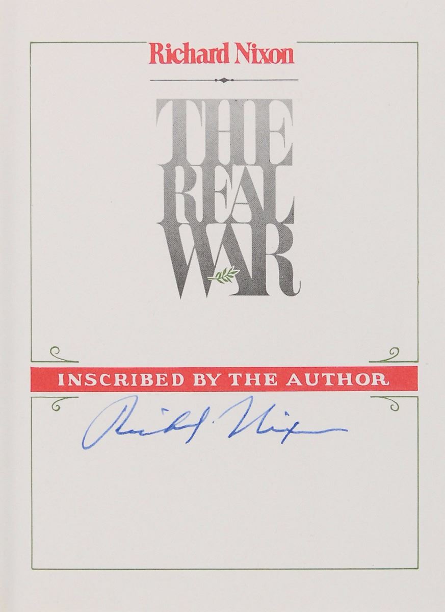 Blue ink signature, “Richard Nixon,” on a 4 x 5.5 bookplate for his 1980 book, The Real War. In fine condition. Accompanied by a hardcover first edition of the book. From the collection of noted publisher and founder of Lord John Press, Herb Yellin.