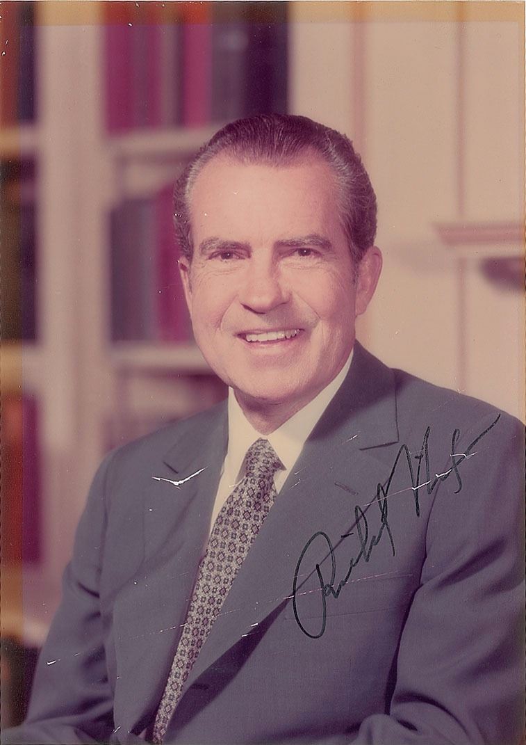 Color satin-finish 5 x 7 photo of a smiling Nixon, signed in black felt tip. In very good condition, with toning to edges and a few scratches, some touching the signature.