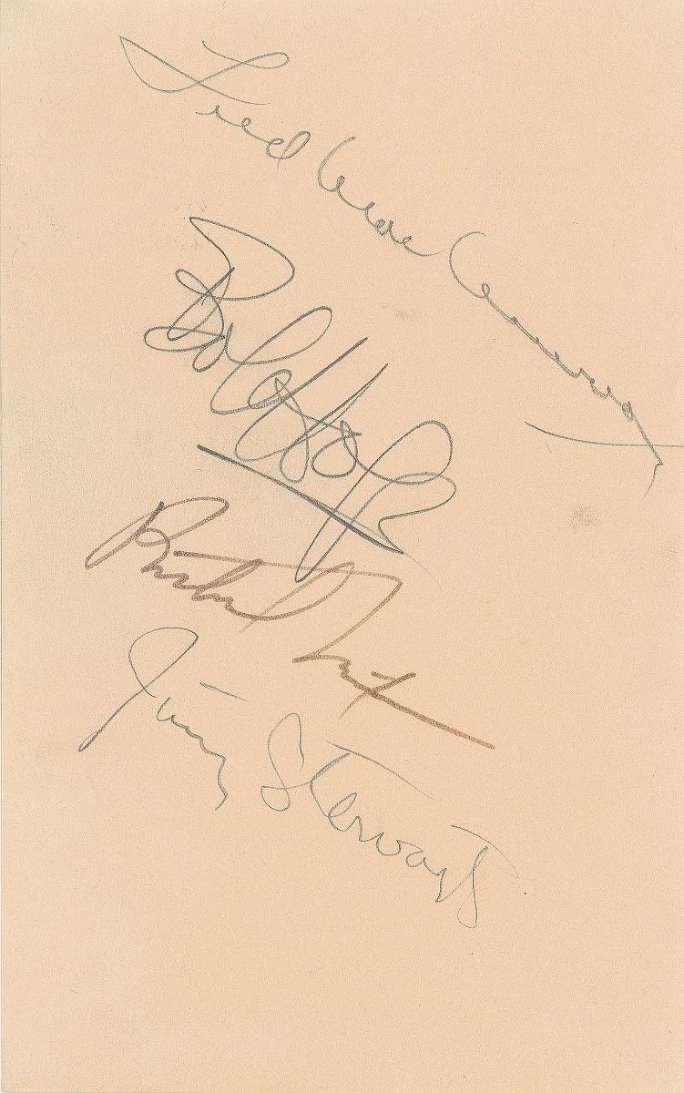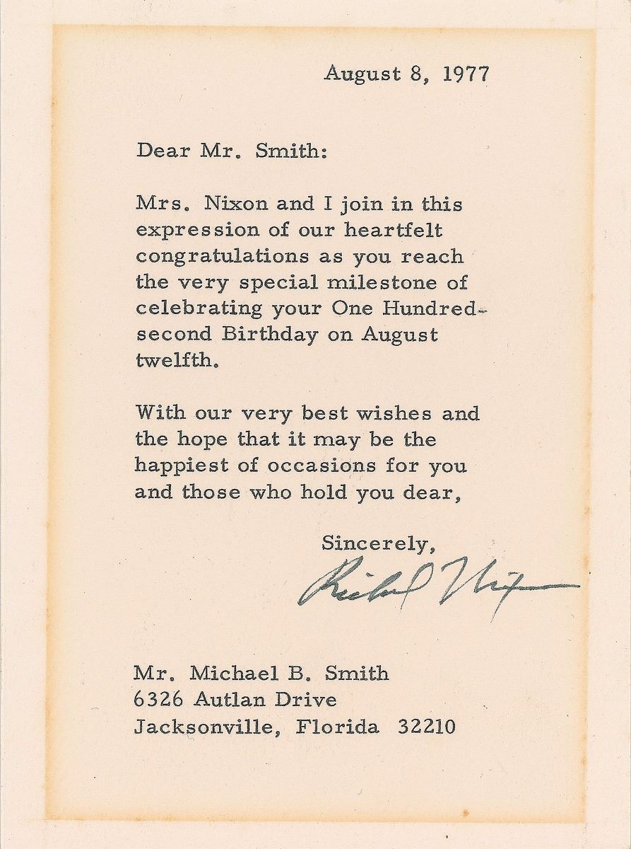 Two items: a TLS, one page, 4.5 x 6.25, April 8, 1977, to a centenarian, in part: “Mrs. Nixon and I join in this expression of our heartfelt congratulations as you reach the very special milestone of celebrating your One Hundred-second Birthday”; and a felt tip signature, “Richard Nixon,” on an off-white 5 x 8 sheet also signed in pencil by actors Fred MacMurray, Bob Hope, and James Stewart. In fine condition, with a block of toning to the letter from previous display.