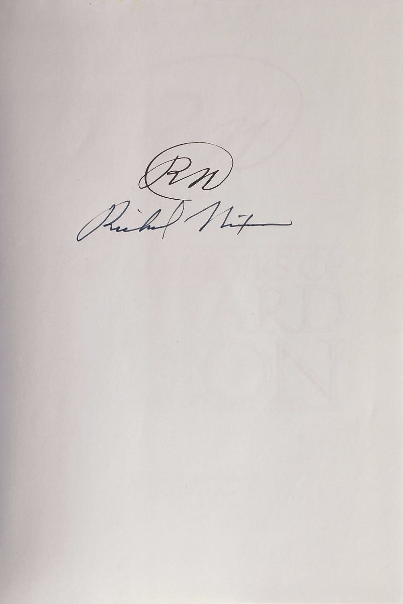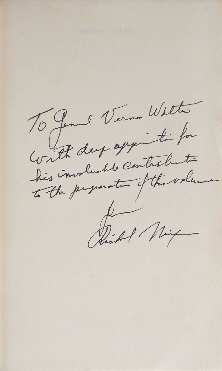 Two signed books: a second printing of The Memoirs of Richard Nixon, hardcover with dust jacket, signed on the half–title page in black ink, “Richard Nixon”; and a French edition of The Real War, custom leather-bound hardcover, signed and inscribed on the first free end page in black ink, “To General Vernon Walton, with deep appreciation for his invaluable contribution to the preparation of this volume, from, Richard Nixon.” In overall fine condition.