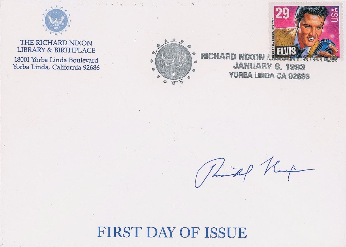 Special Nixon Library FDC featuring the 29–cent Elvis postage stamp, 7.25 x 5.25, signed in blue felt tip by Nixon. In very fine condition. The envelope has been postmarked at the Richard Nixon postal station in Yorba Linda on the day the stamp was issued. Nixon signed a limited edition of 80 of these Elvis FDCs and refused to sign any more beyond that, making this item quite rare.