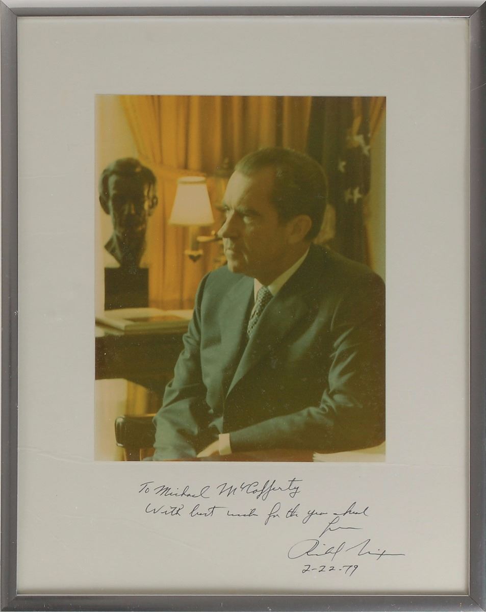 Color textured matte-finish 7 x 8.75 photo of Nixon in the Oval Office, affixed to its original 10.75 x 13.75 mount, signed and inscribed on the mount in black ink, “To Michael McCafferty, With best wishes for the year ahead, from, Richard Nixon, 2–22–79.” Framed and in fine condition, with light creasing to the mount.