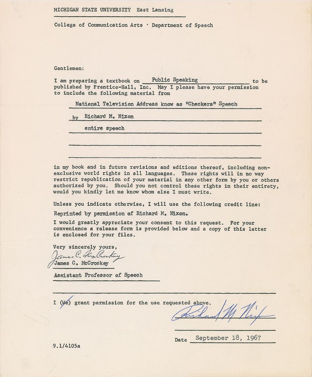 DS, signed “Richard M. Nixon,” one page, 8.5 x 10.25, September 18, 1967. Document from an assistant professor compiling a textbook on public speaking, requesting permission to publish the “National Television Address know[n] as ‘Checkers’ Speech by Richard M. Nixon: entire speech.” Nixon signs at the conclusion to grant his approval. In fine condition.