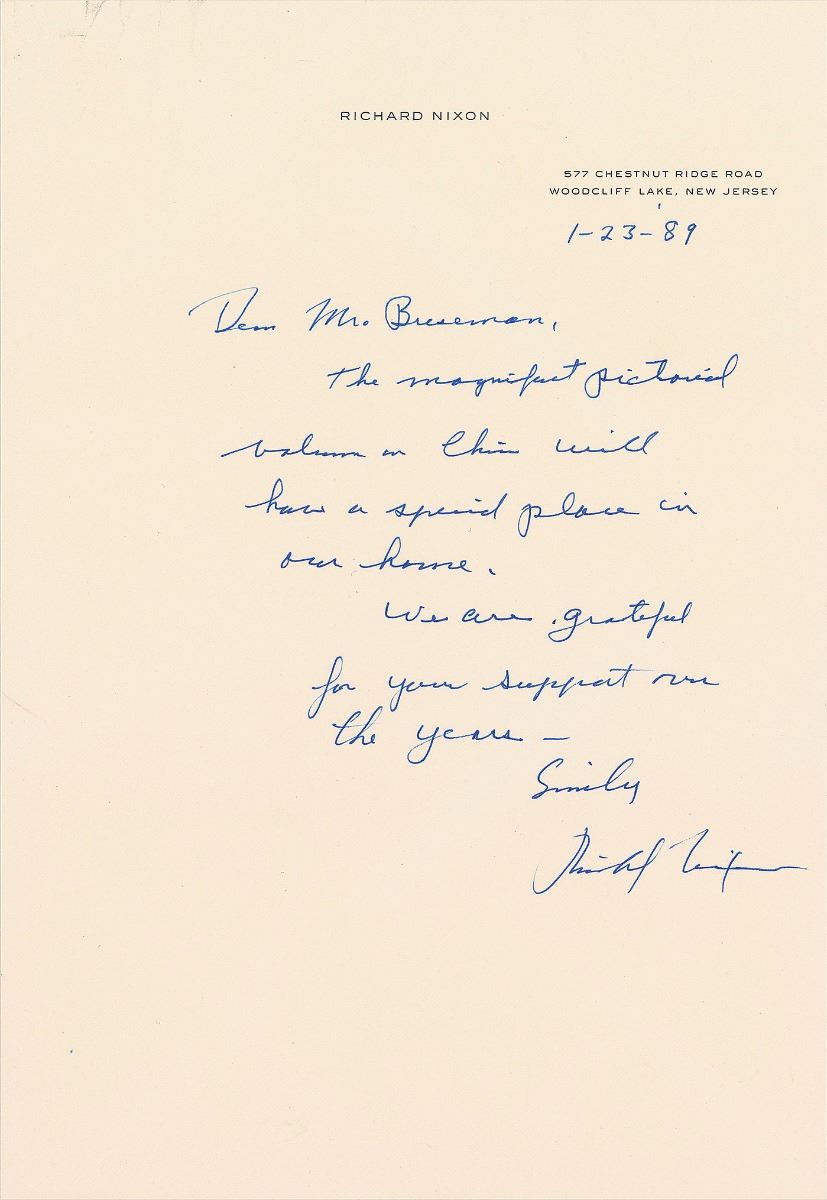 Uncommon ALS, one page, 7.25 x 10.5, personal letterhead, January 23, 1989. Thank-you letter for a birthday gift, in full: “The magnificent pictorial volume on China will have a special place in our home. We are grateful for your support over the years.” In fine condition.