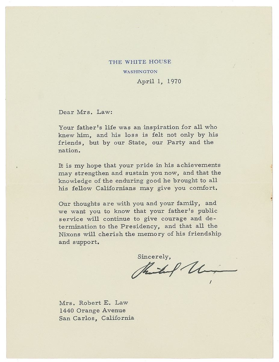TLS as president, one page, 6.75 x 8.75, White House letterhead, April 1, 1970. Letter to the wife of Robert E. Law, in full: “Your father’s life was an inspiration for all who knew him, and his loss is felt not only by his friends, but by our State, our Party and the nation. It is my hope that your pride in his achievements may strengthen and sustain you now, and that the knowledge of the enduring good he brought to all his fellow Californians may give you comfort. Our thoughts are with you and your family, and we want you to know that your father’s public service will continue to give courage and determination to the Presidency, and that all the Nixons will cherish the memory of his friendship and support.” In fine condition. Accompanied by the original mailing envelope. President Nixon letters signed in full are rather uncommon.