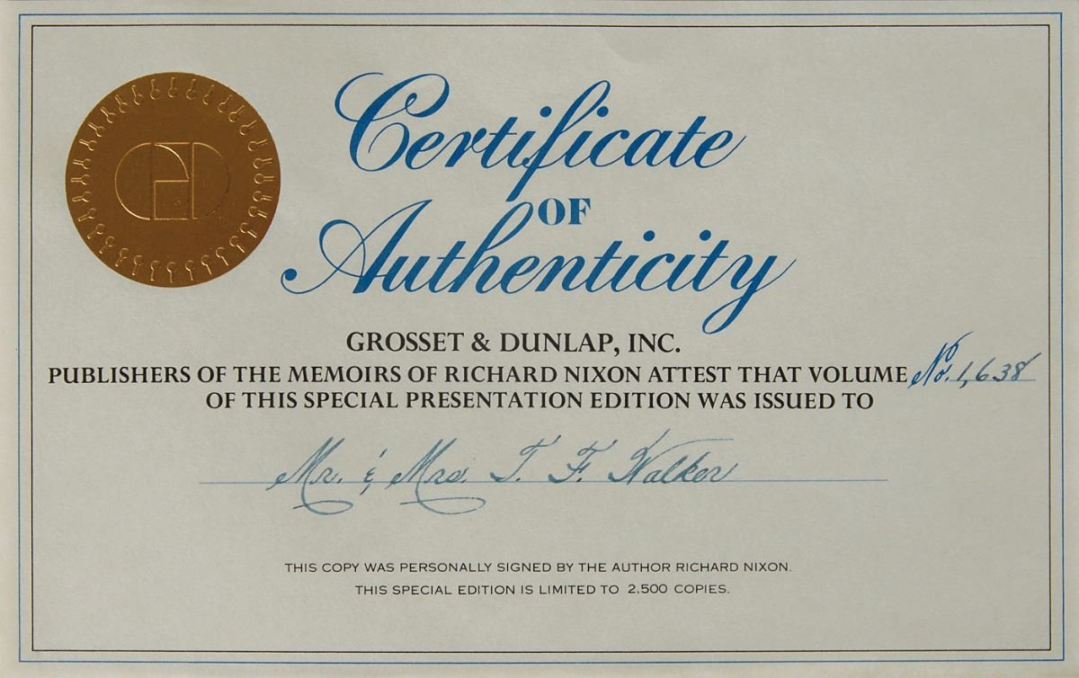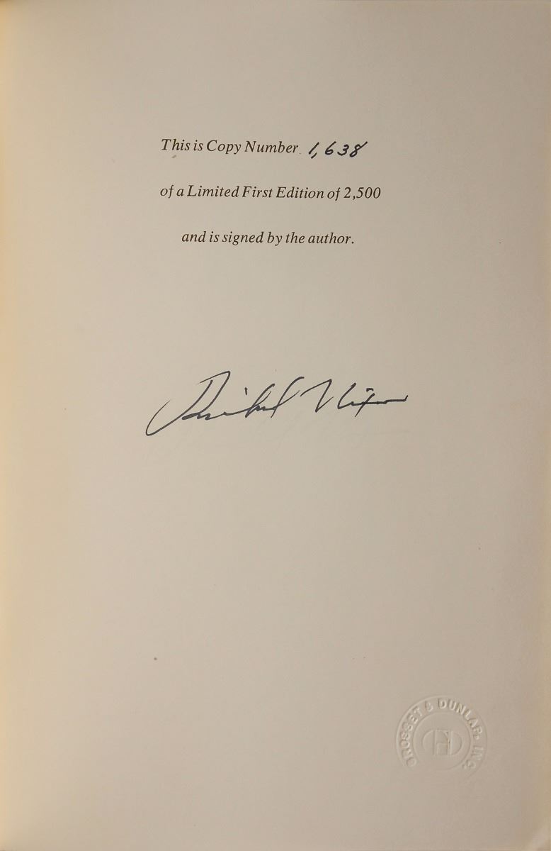 Signed book: The Memoirs of Richard Nixon. First edition, limited issue, numbered 1638/2500. NY: Grosset and Dunlap, 1978. Leatherbound hardcover, 7 x 9.5, 1120 pages. Signed on the colophon in black ink. In fine condition. Accompanied by the publisher’s certificate of authenticity.