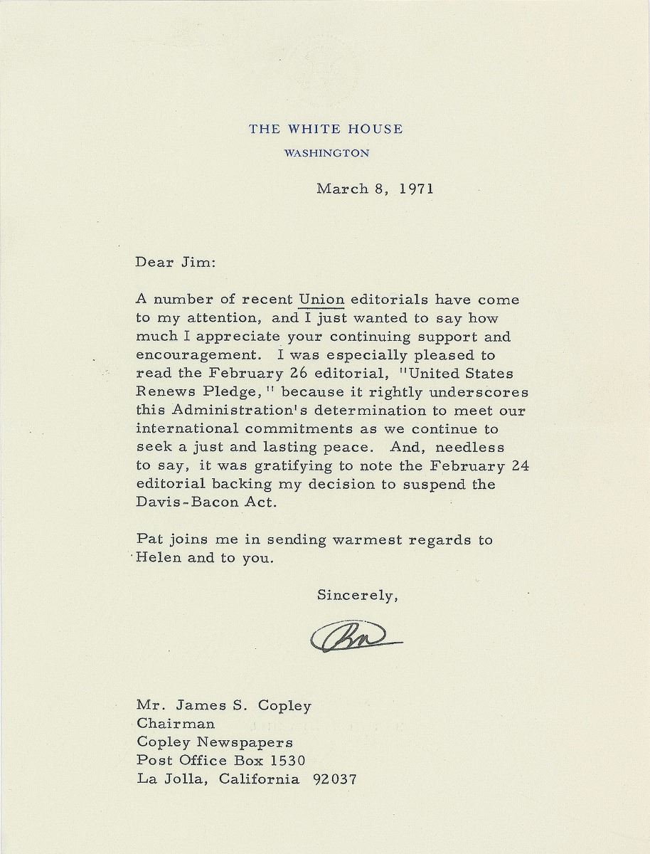 TLS as president signed “RN,” one page, 6.75 x 8.75, White House letterhead, March 8, 1971. Letter to James S. Copley, chairman of Copley Newspapers, in full: "A number of recent Union editorials have come to my attention, and I just wanted to say how much I appreciate your continuing support and encouragement. I was especially pleased to read the February 26 editorial, 'United States Renews Pledge,' because it rightly underscores this Administration's determination to meet our international commitments as we continue to seek a just and lasting peace. And, needless to say, it was gratifying to note the February 24 editorial backing my decision to suspend the Davis-Bacon Act. Pat joins me in sending warmest regards to Helen and to you." In fine condition, with light creasing near top edge.