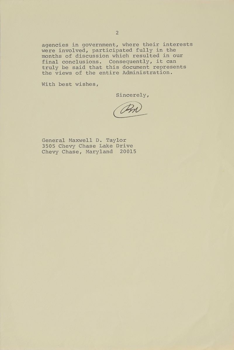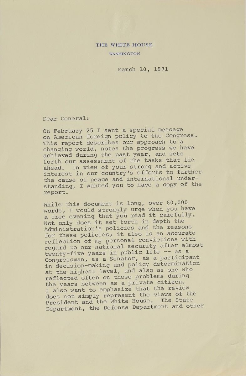TLS as president signed “RN,” two pages, 6.75 x 10.5, White House letterhead, March 10, 1971. Letter to General Maxwell D. Taylor, in full: "On February 25 I sent a special message on American foreign policy to the Congress. This report describes our approach to a changing world, notes the progress we have achieved during the past year, and sets forth our assessment of the tasks that lie ahead. In view of your strong and active interest in our country's efforts to further the cause of peace and international understanding, I wanted you to have a copy of the report. While this document is long, over 60,000 words, I would strongly urge when you have a free evening that you read it carefully. Not only does it set forth in depth the Administration's policies and the reasons for these policies; it also is an accurate reflection of my personal convictions with regard to our national security after almost twenty-five years in public life—as a Congressman, as a Senator, as a participant in decision-making and policy determination at the highest level, and also as one who reflected often on these problems during the years between as a private citizen. I also want to emphasize that the review does not simply represent the views of the President and the White House. The State Department, the Defense Department and other agencies in government, where their interests were involved, participated fully in the months of discussion which resulted in our final conclusions. Consequently, it can truly be said that this document represents the views of the entire Administration." In fine condition, with scattered light creasing.