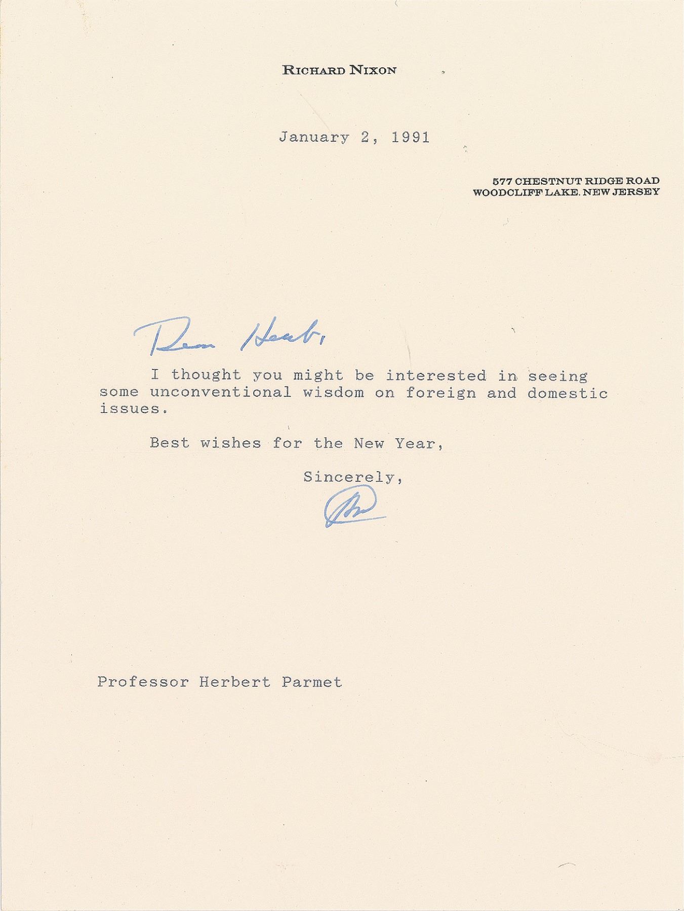 TLS signed “RN,” one page, 6.75 x 9, personal letterhead, January 2, 1991. Letter to historian Herbert Parmet, in full: "I thought you might be interested in seeing some unconventional wisdom on foreign and domestic issues." In fine condition. Parmet authored two books on Nixon: Richard Nixon and His America in 1990, and Richard M. Nixon: An American Enigma in 2008.