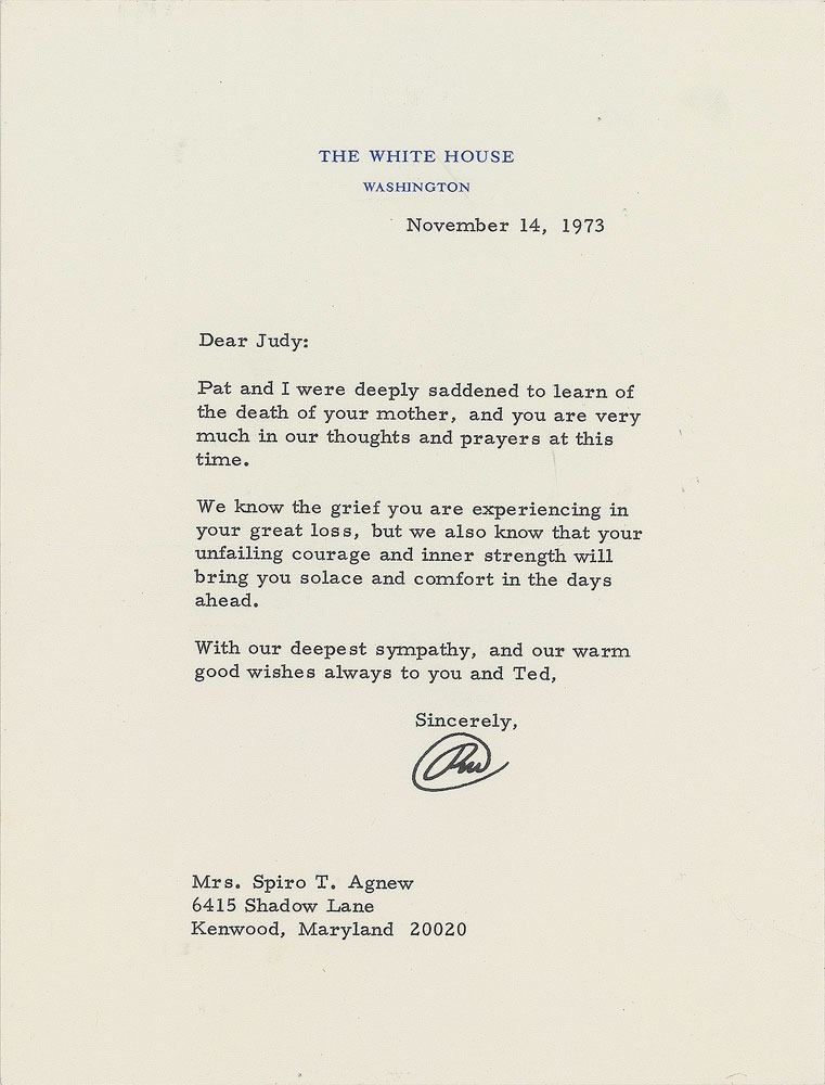 TLS as president signed “RN,” one page, 6.75 x 8.75, White House letterhead, November 14, 1973. Letter to Judy Agnew, the wife of former Vice President Spiro Agnew, in full: "Pat and I were deeply saddened to learn of the death of your mother, and you are very much in our thoughts and prayers at this time. We know the grief you are experiencing in your great loss, but we also know that your unfailing courage and inner strength will bring you solace and comfort in the days ahead. With our deepest sympathy, and our warm good wishes always to you and Ted." In fine to very fine condition. Accompanied by the original mailing envelope. A month earlier on October 10, Spiro Agnew plead no contest to tax evasion for the year 1967 and resigned from his position as vice president of the United States.