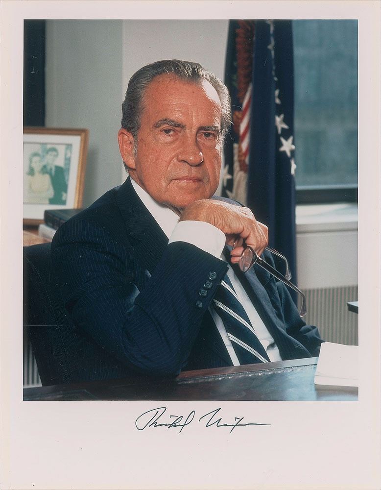 Color satin-finish 8.5 x 11 photo of Nixon at his desk, signed in the lower border in black felt tip. In fine condition.