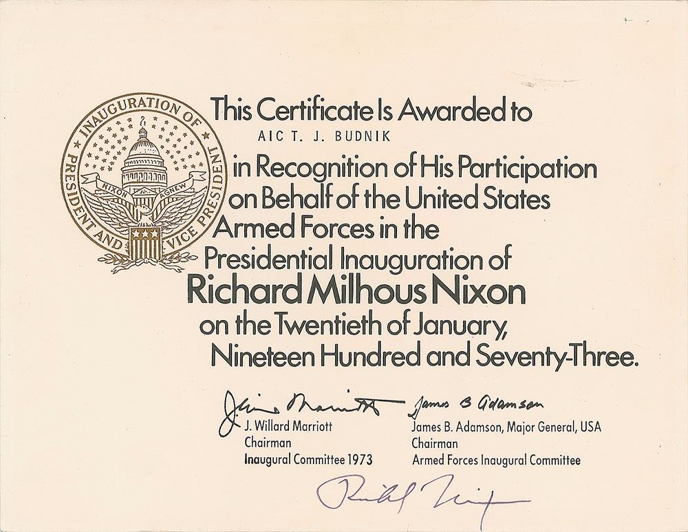 Two items: a DS, one page, 11 x 8.5, January 20, 1973, an award presented on behalf o the United States Armed Forces to AIC T. J. Budnik for his participation in Nixon’s inauguration, signed at the bottom in black felt tip by Nixon; and a color satin-finish 3.5 x 3.25 candid photo of Nixon standing in a classroom with a young student, signed in thin black felt tip. In overall fine condition.