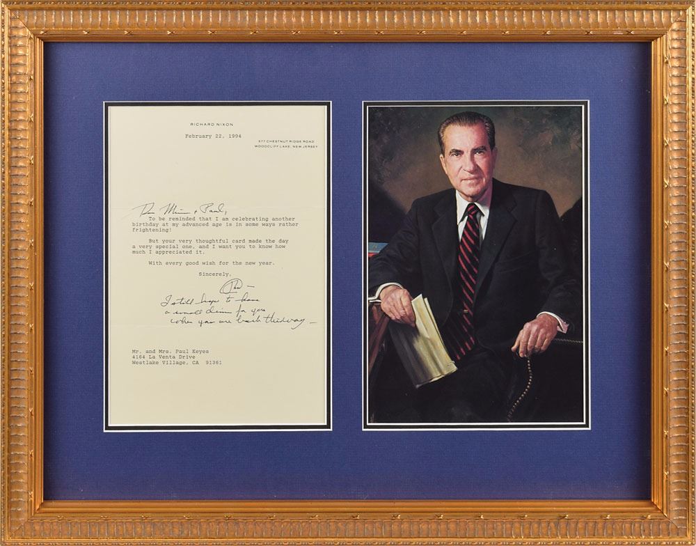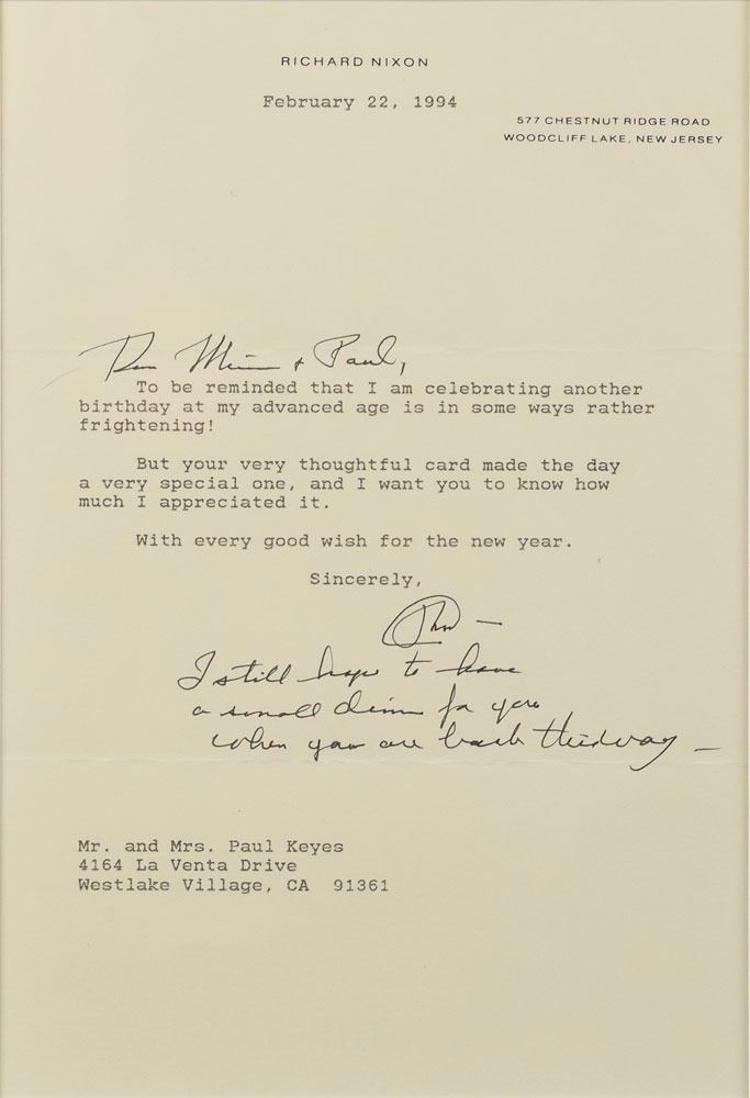 TLS signed “RN,” one page, 6.5 x 9.5, personal letterhead, February 22, 1994. Letter to Mr. and Mrs. Paul Keyes, in part: "To be reminded that I am celebrating another birthday at my advanced age is in some ways rather frightening! But your very thoughtful card made the day a very special one, and I want you to know how much I appreciated it." In addition to a handwritten salutation, Nixon adds: "I still hope to have a small dinner for you when you are back this way." Nicely double-matted and framed with a portrait to an overall size of 20.5 x 16. In fine condition. Accompanied by the original mailing envelope.