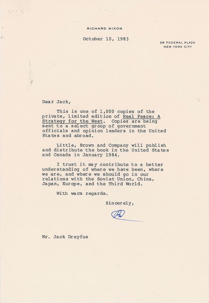 TLS signed “RN,” one page, 7.25 x 10.5, personal letterhead, October 10, 1983. Letter to Jack Dreyfus, in part: "This is one of 1,000 copies of the private, limited edition of Real Peace: A Strategy for the West. Copies are being sent to a select group of government officials and opinion leaders in the United States and abroad…I trust it may contribute to a better understanding of where we have been, where we are, and where we should go in our relations with the Soviet Union, China, Japan, Europe, and the Third World." In fine condition.