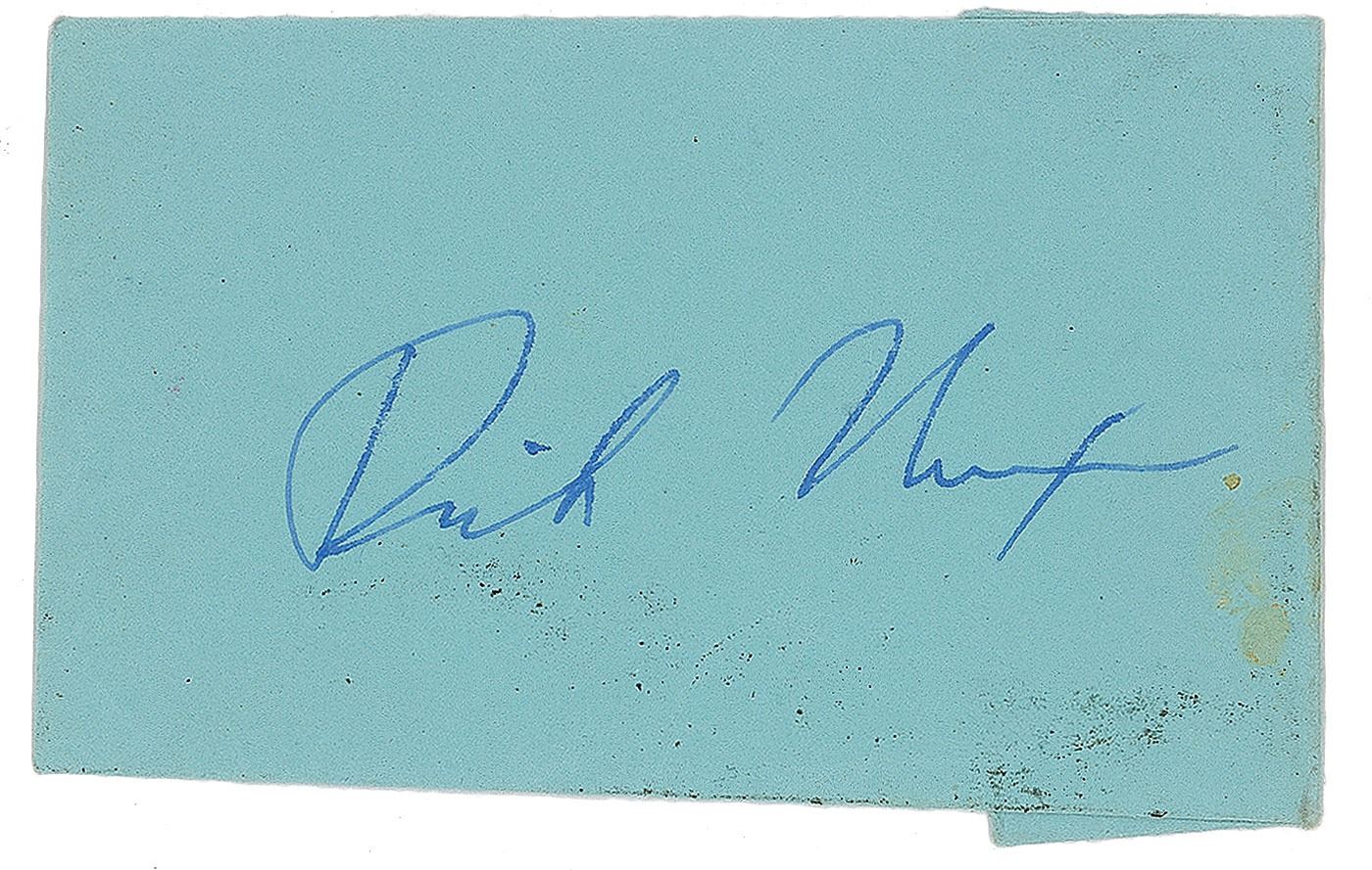 Ink signature, "Dick Nixon," on a folded blue 3.5 x 2.25 sheet. In fine condition.
