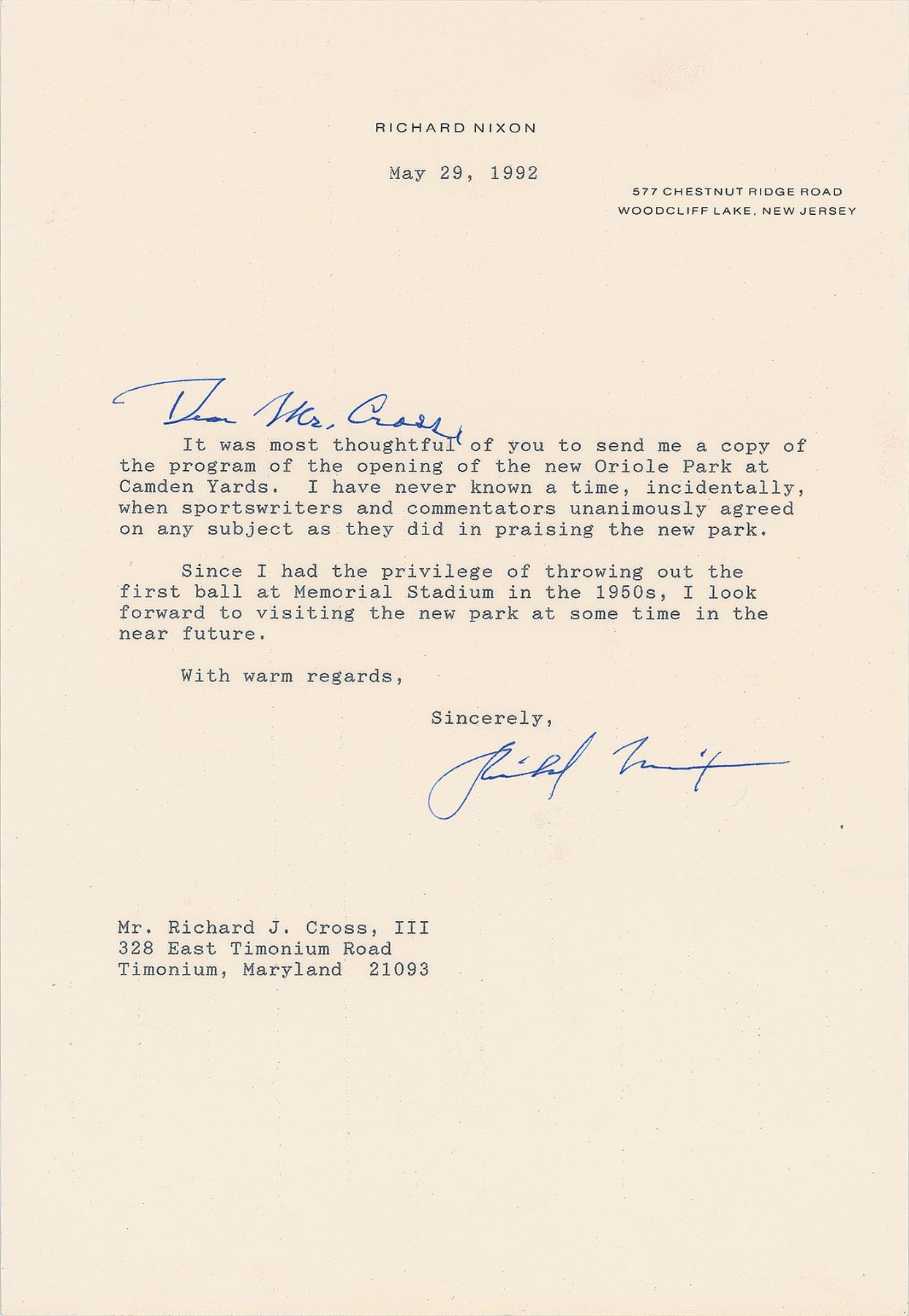 TLS, one page, 7.25 x 10.5, personal letterhead, May 29, 1992. Letter to Richard J. Cross III, in full: "It was most thoughtful of you to send me a copy of the program of the opening of the new Oriole Park at Camden Yards. I have never known a time, incidentally, when sportswriters and commentators unanimously agreed on any subject as they did in praising the new park. Since I had the privilege of throwing out the first ball at Memorial Stadium in the 1950s, I look forward to visiting the new park at some time in the near future." In fine condition.
