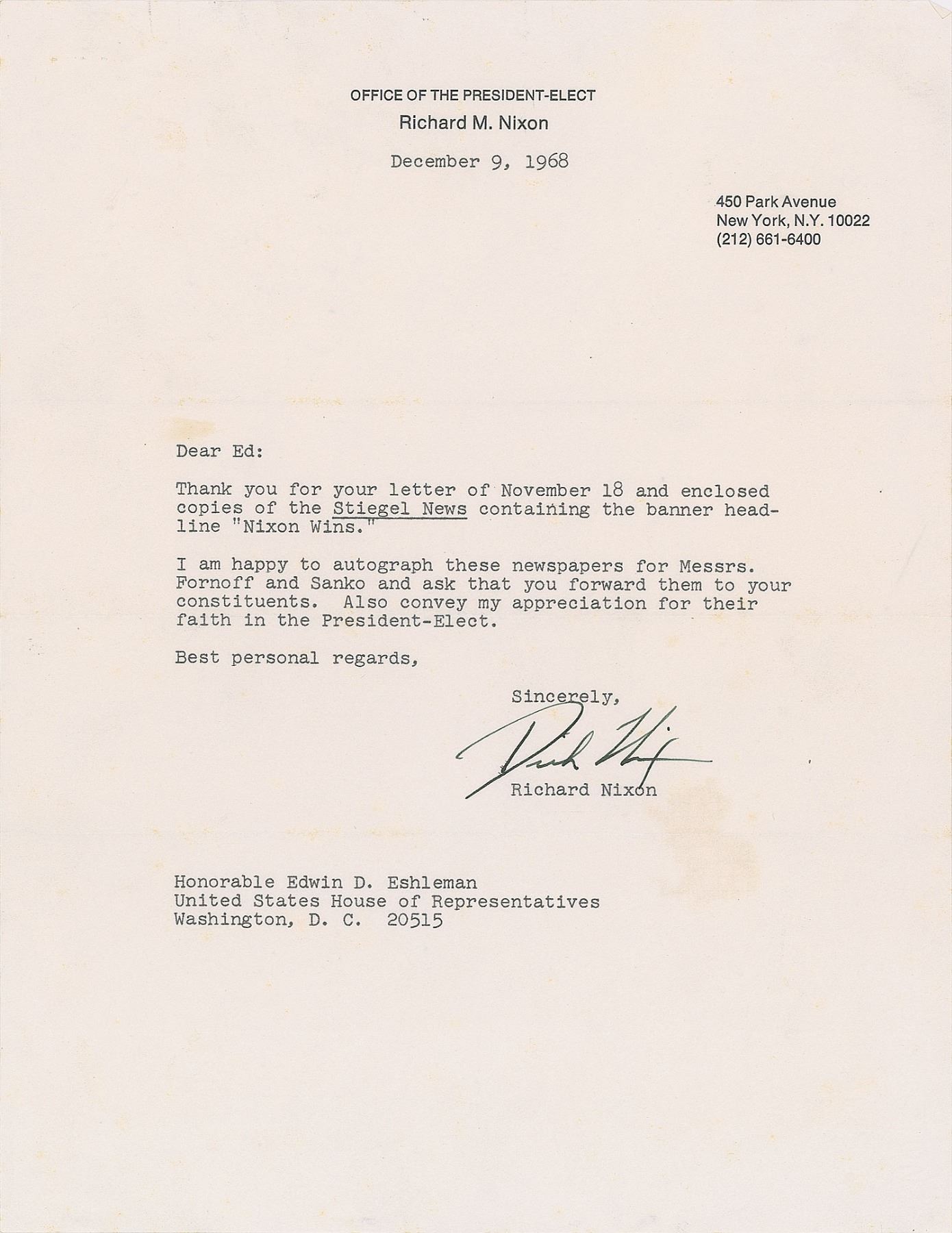 TLS signed “Dick Nixon,” one page, 8.5 x 11, Office of the President–Elect letterhead, December 9, 1968. Letter to Pennsylvania Congressman Edwin D. Eshleman, in full: "Thank you for your letter of November 18 and enclosed copies of the Stiegel News containing the banner headline 'Nixon Wins.' I am happy to autograph these newspapers for Messrs. Fornoff and Sanko and ask that you forward them to your constituents. Also convey my appreciation for their faith in the President-Elect." In fine condition, with scattered light creasing, and light show-through from an old mounting remnant on the reverse. An appealing offering given the decidedly uncommon "President-Elect" letterhead—a month earlier Nixon ousted Hubert Humphrey and George Wallace in the presidential election of 1968.