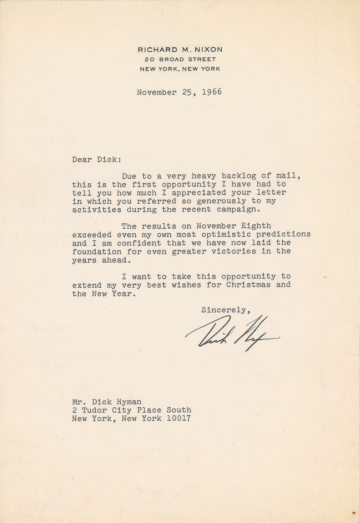 TLS, one page, 7.25 x 10.5, personal letterhead, November 25, 1966. Letter to Dick Hyman, in part: "Due to a very heavy backlog of mail, this is the first opportunity I have had to tell you how much I appreciated your letter in which you referred so generously to my activities during the recent campaign. The results on November Eighth exceeded even my own most optimistic predictions and I am confident that we have now laid the foundation for even greater victories in the years ahead. I want to take this opportunity to extend my best wishes for Christmas and the New Year." In fine condition.