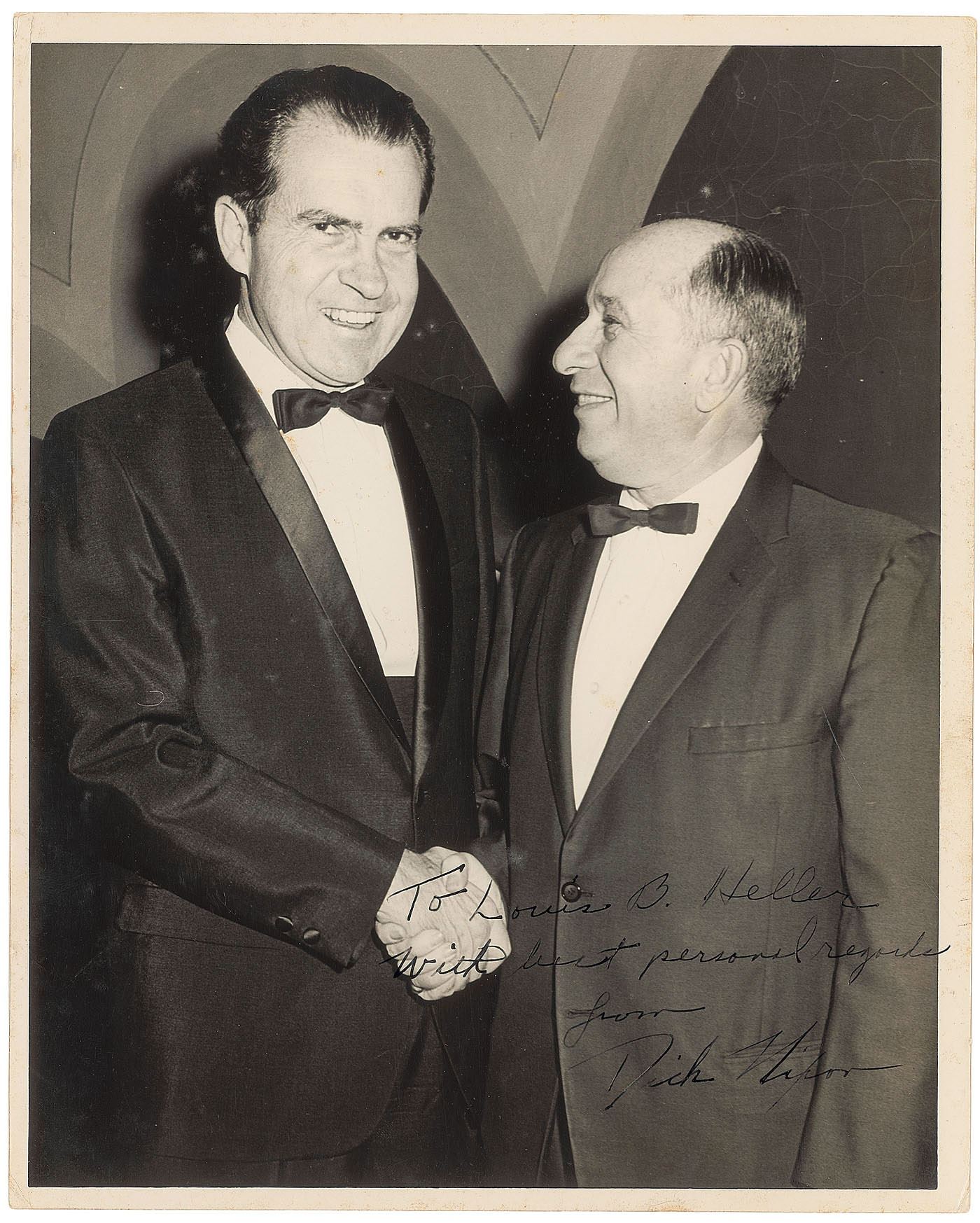 Glossy 8 x 10 photo of Nixon shaking hands with Judge Louis Heller at the Brooklyn Bar Association annual dinner on December 2, 1964, signed and inscribed in the lower right in black ink, "To Louis B. Heller, with best personal regards, from Dick Nixon." Reverse bears a credit stamp for photographer Jay Sharp, who has added event details below. Light scattered foxing and soiling, some silvering to dark areas of the image, slight creasing to corners, and irregular ink adhesion to portions of the signature, otherwise fine condition.