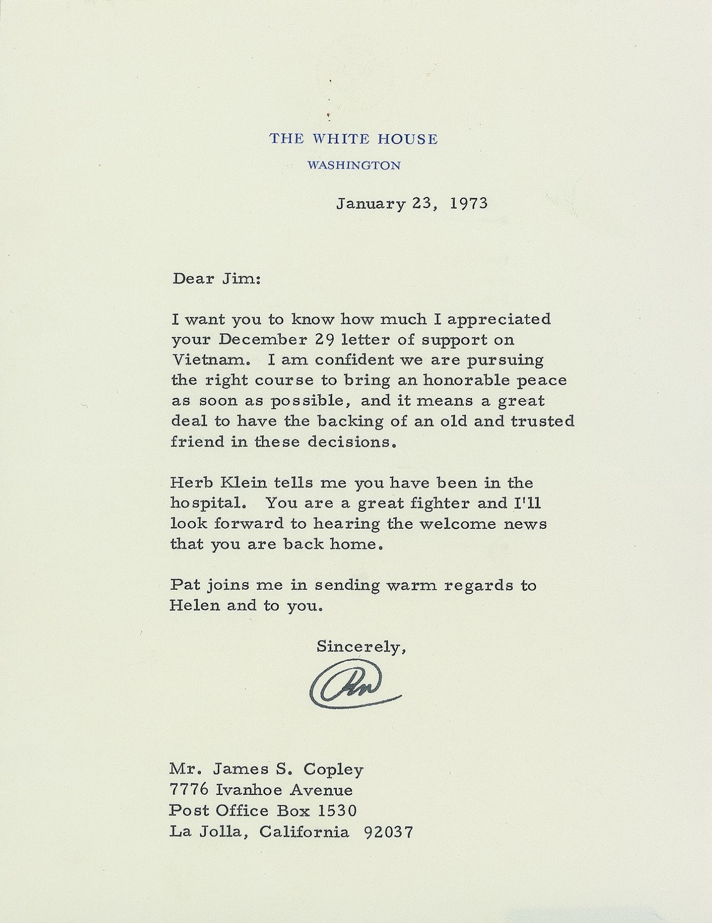TLS as president signed "RN," one page, 6.75 x 8.75, White House letterhead, January 23, 1973. Letter to James S. Copley, chairman of Copley Newspapers, in full: "I want you to know how much I appreciated your December 29 letter of support on Vietnam. I am confident we are pursuing the right course to bring an honorable peace as soon as possible, and it means a great deal to have the backing of an old and trusted friend in these decisions. Herb Klein tells me you have been in the hospital. You are a great fighter and I'll look forward to hearing the welcome news that you are back at home. Pat joins me in sending regards to Helen and you." In very fine condition. Accompanied by the original mailing envelope.