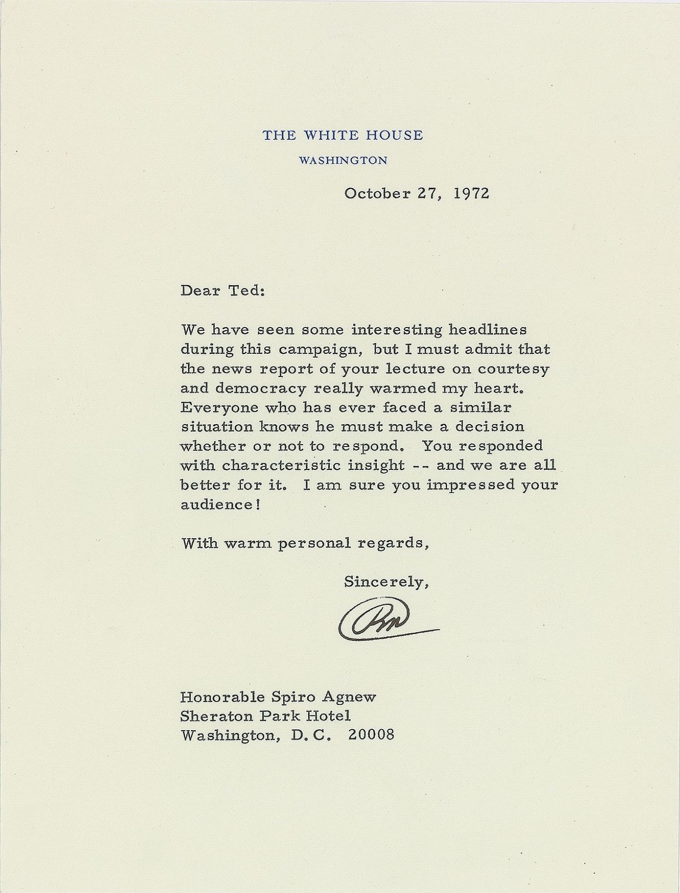 TLS as president signed "RN," one page, 6.75 x 8.75, White House letterhead, October 27, 1972. Letter to "Ted," Vice President Spiro T. Agnew, in full: "We have seen some interesting headlines during this campaign, but I must admit that the news report of your lecture on courtesy and democracy really warmed my heart. Everyone who has ever faced a similar situation knows he must make a decision whether or not to respond. You responded with characteristic insight—and we are all better for it. I am sure you impressed your audience!" In fine condition. Accompanied by the original transmittal envelope. Originates from the personal estate of Spiro Agnew.