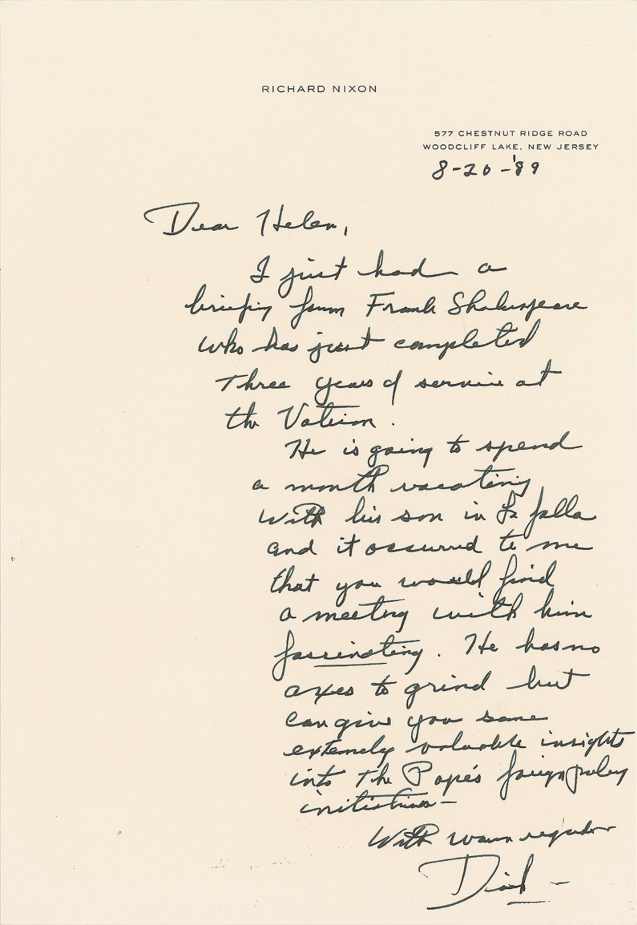 ALS signed “Dick,” one page, 7.25 x 10.5, personal letterhead, August 20, 1989. Letter to his friend, newspaper publisher Helen Copley, suggesting she speak with the former US Ambassador to the Vatican, Frank Shakespeare, in full, ''I just had a briefing from Frank Shakespeare who has just completed three years of service at the Vatican. He is going to spend a month vacating [sic] with his son and it occurred to me that you would find a meeting with him fascinating. He has axes to grind but can give you some extremely valuable insights into the Pope's foreign policy initiatives. With warm regards.'' In fine condition. Accompanied by the original mailing envelope. Shakespeare served as Nixon's Director of the US Information Agency from 1969 to 1973, and then as ambassador to the Vatican from January 1987 to July 1989. Copley succeeded her husband James S. Copley as the head of the Union Tribune Publishing Company in San Diego upon his death in 1973. Additionally, she was also chairman and CEO of the Copley Press, a publisher and newspaper chain that consisted of 15 daily and 32 weekly publications. An uncommon handwritten letter from Nixon offering his networking help.