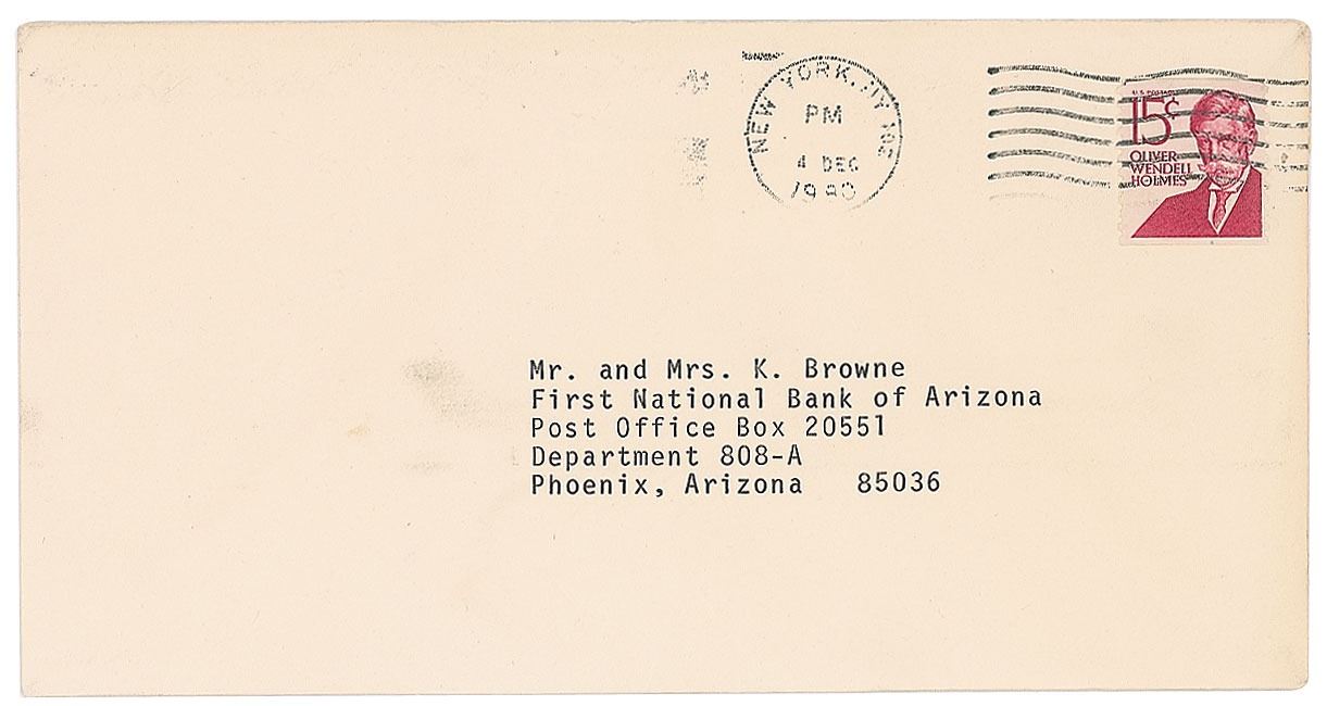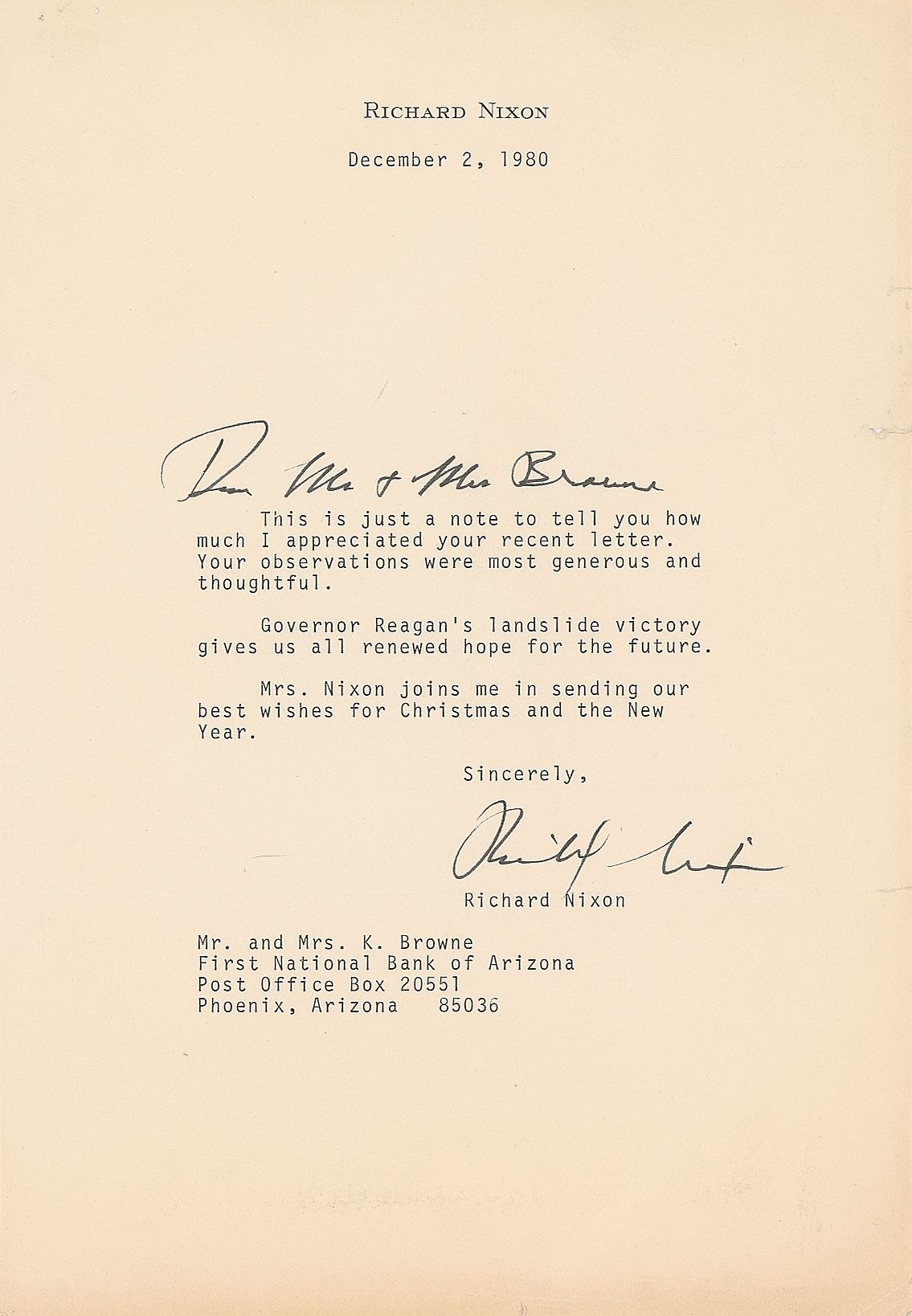 TLS, one page, 7.25 x 10.5, personal letterhead, December 2, 1980. Letter to Mr. and Mrs. Ken Browne, in full: "This is just a note to tell you how much I appreciated your recent letter. Your observations were most generous and thoughtful. Governor Reagan's landslide victory gives us all renewed hope for the future. Mrs. Nixon joins me in sending our best wishes for Christmas and the New Year." Nixon adds the salutation in his own hand, "Dear Mr. & Mrs. Browne." In very good to fine condition, with staple holes to the upper left corner, and a very short tear to the right edge. Accompanied by the original mailing envelope.