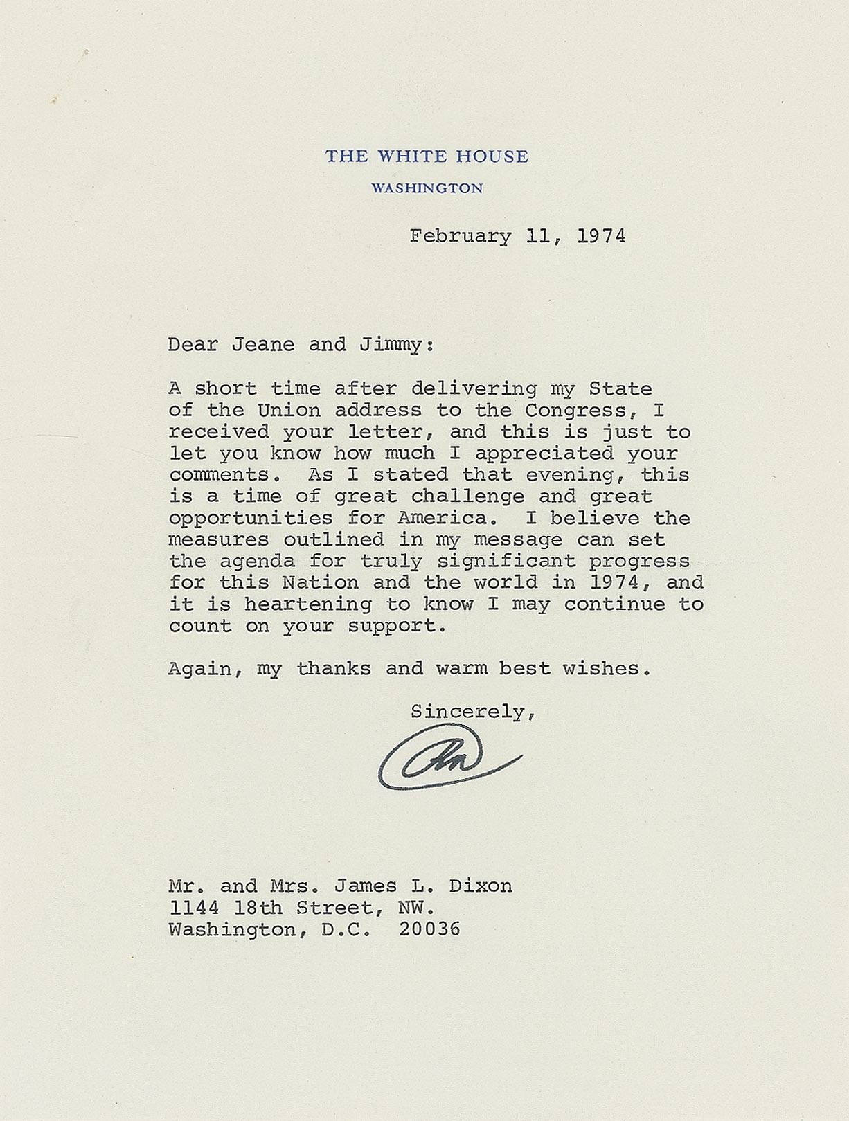 TLS as president signed “RN,” one page, 6.75 x 8.75, White House letterhead, February 11, 1974. Letter to acclaimed psychic and astrologist Jeane Dixon and her husband Jimmy, in full: "A short time after delivering my State of the Union address to the Congress, I received your letter, and this is just to let you know how much I appreciated your comments. As I stated that evening, this is a time of great challenge and great opportunities in America. I believe the measures outlined in my message can set the agenda for truly significant progress for this Nation and the world in 1974, and it is heartening to know I may continue to count on your support. Again, my thanks and warm best wishes." In fine condition, with staple holes to the upper left corner. Accompanied by the original mailing envelope and an original glossy 8 x 10 photograph of Nixon with the Dixons. Exactly three weeks later, on March 4, 1974, seven of Nixon's former presidential aides were formally indicted on actions relative to the Watergate break-in. Nixon, who was listed as a co-conspirator, resigned five months later.