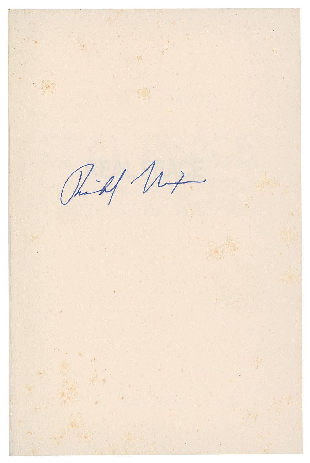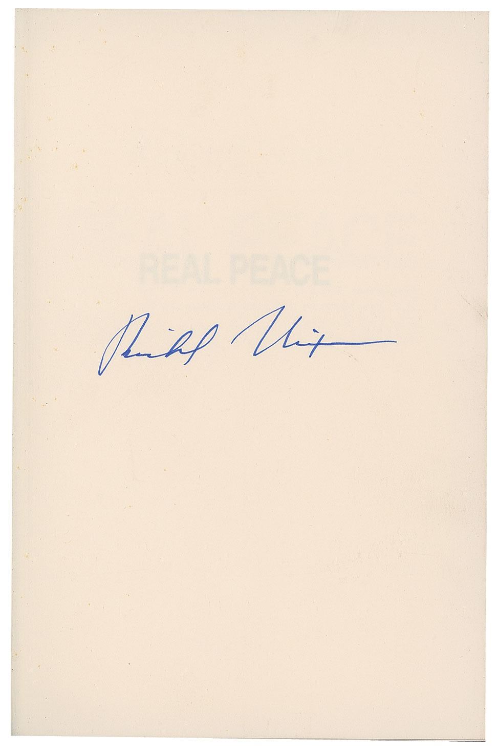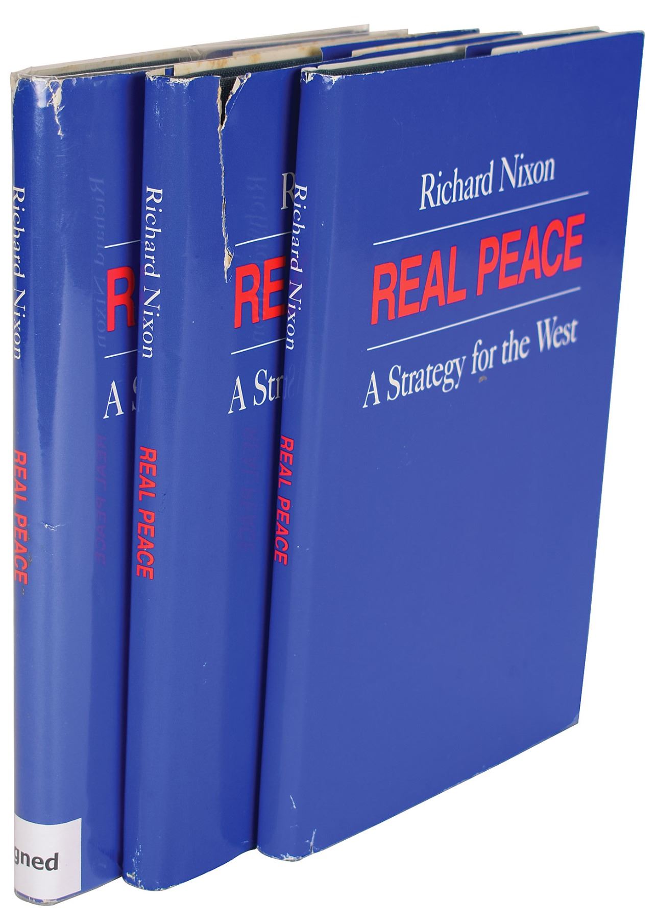 Three signed books: Real Peace: A Strategy for the West. First edition, first printing. NY: Privately printed, 1983. Hardcover with dust jacket, 5.75 x 8.5, 106 pages. Each signed on the first free end page in felt tip by Richard Nixon, with one inscribed in another hand, "To Jim Hayes, without whom there can be no real peace." In overall very good to fine condition, with creasing and tears to the dust jackets. Nixon self-published one thousand copies of this book in September 1983, sending them to a 'select group of government officials and opinion leaders.' The book was then picked up and published in a trade edition by Little, Brown and Company in 1984.