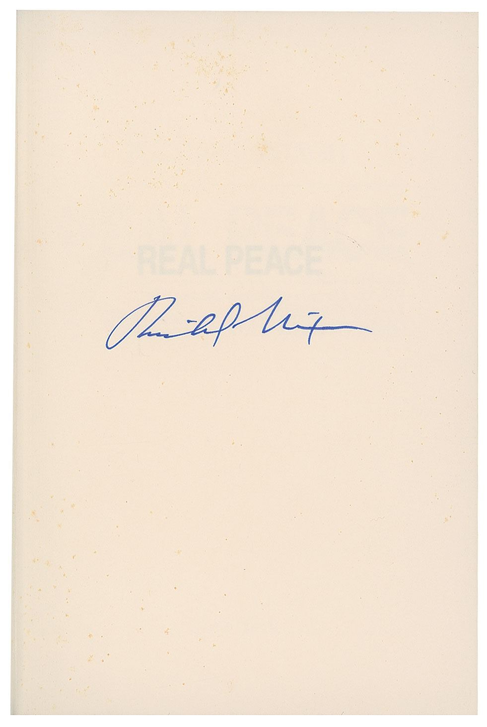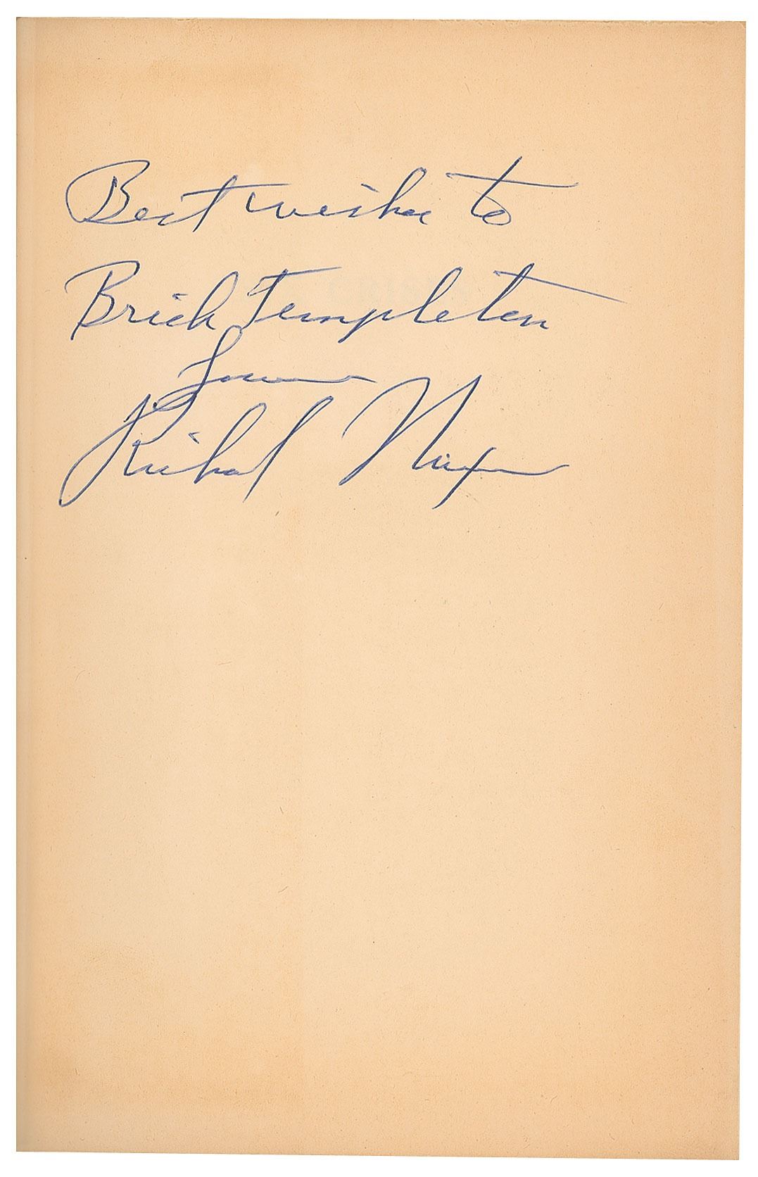 Two signed books: Real Peace: A Strategy for the West, privately printed in an edition of 1,000 copies, signed on the first free end page in blue felt tip by Richard Nixon; and a first edition of Six Crises, hardcover with dust jacket, signed and inscribed on the first free end page in blue ballpoint, "Best wishes to Brick Templeton, from Richard Nixon." In very good to fine condition, with creasing and tears to the Six Crises dust jacket.