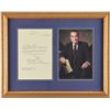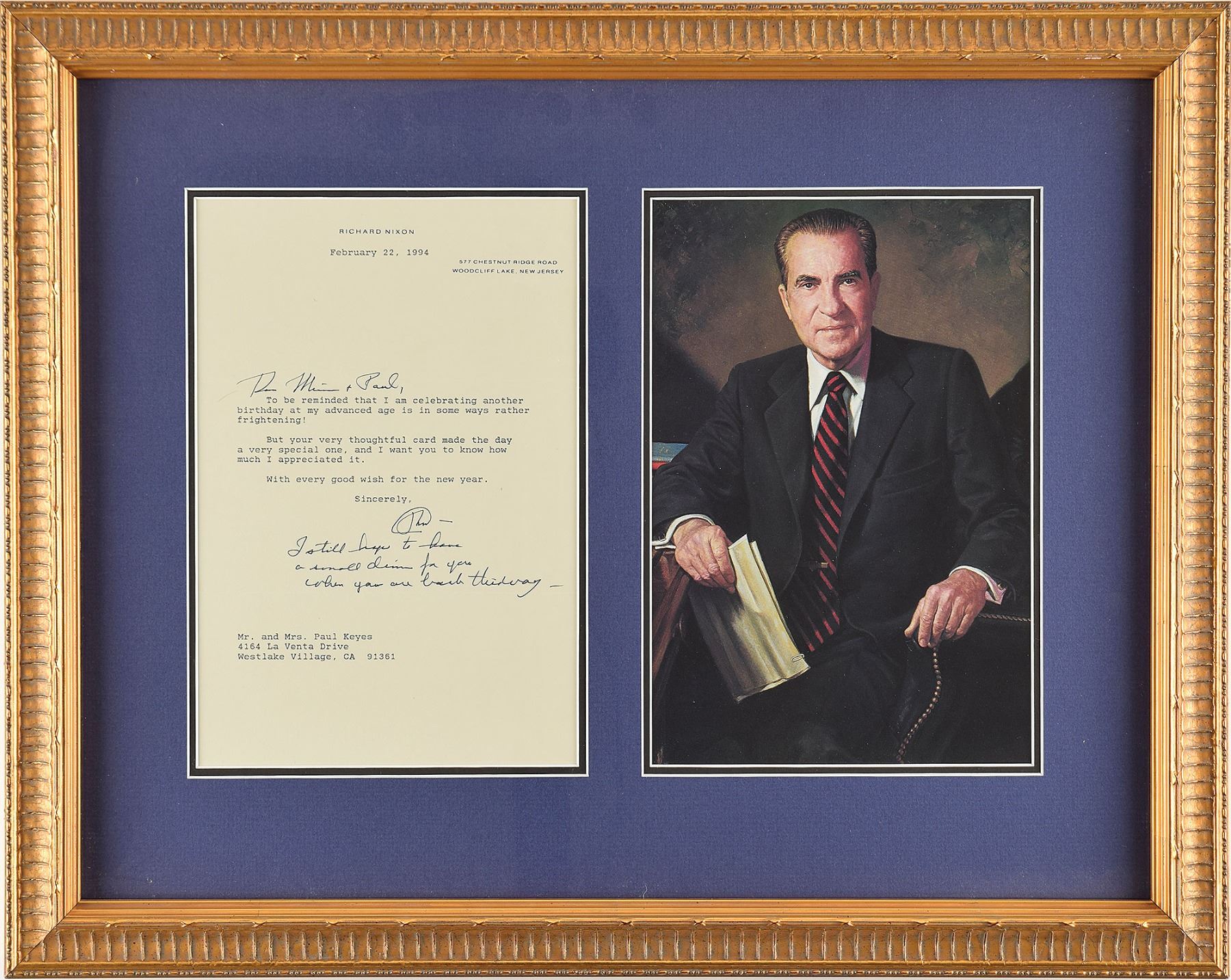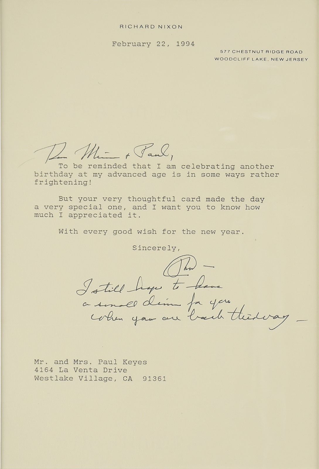 TLS signed “RN,” one page, 6.5 x 9.5, personal letterhead, February 22, 1994. Letter to Mr. and Mrs. Paul Keyes, in part: "To be reminded that I am celebrating another birthday at my advanced age is in some ways rather frightening! But your very thoughtful card made the day a very special one, and I want you to know how much I appreciated it." Nixon adds a handwritten salutation and postscript: "I still hope to have a small dinner for you when you are back this way." Double-matted and framed with a portrait to an overall size of 20.75 x 16.25. In fine condition. Accompanied by the original mailing envelope.