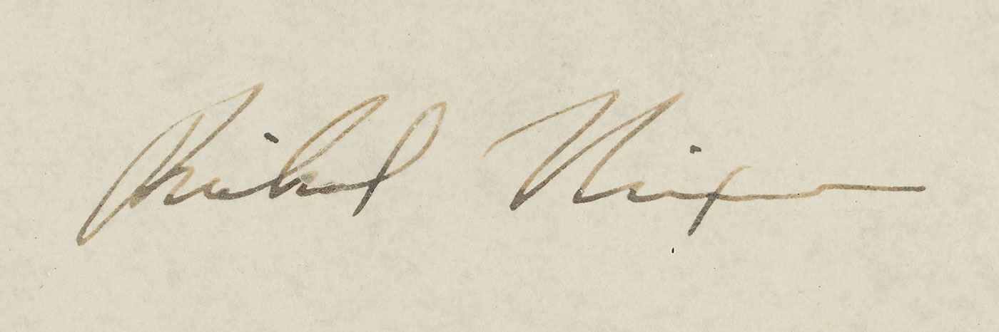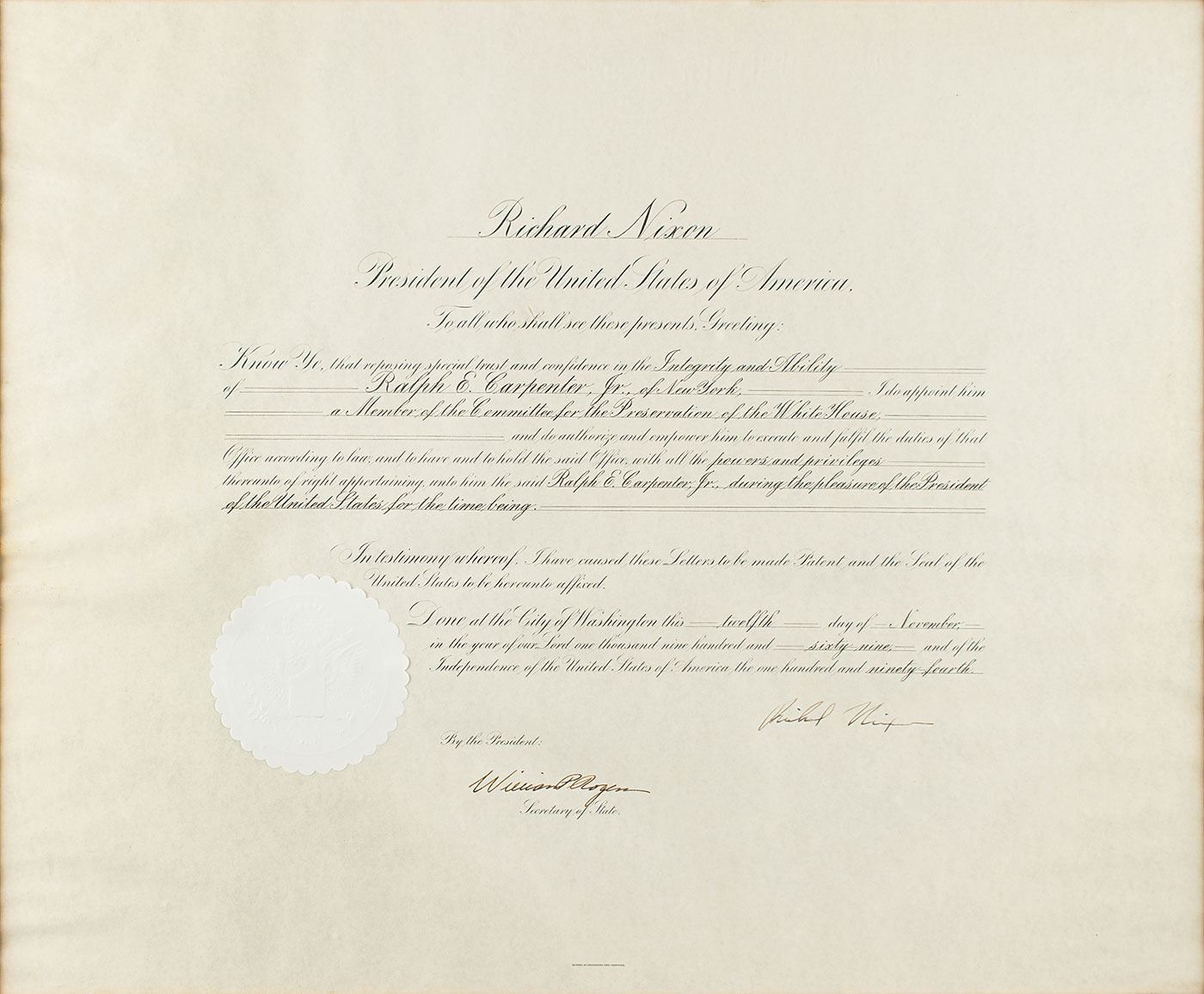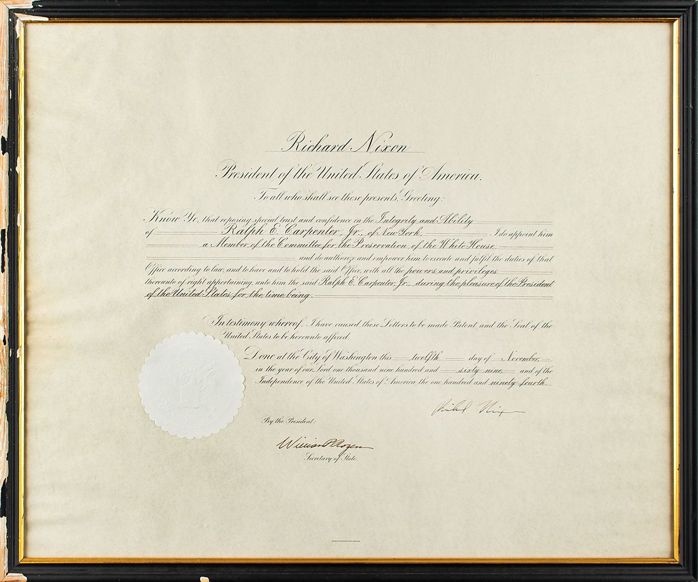 Partly-printed DS, one page, 22.5 x 18.5, November 12, 1969. President Nixon appoints Ralph E. Carpenter, Jr., of New York as "a Member of the Committee for the Preservation of the White House." Boldly signed at the conclusion by President Richard Nixon and countersigned by Secretary of State William P. Rogers. The white paper seal affixed to the lower left remains fully intact. Framed to an overall size of 24 x 20. In fine condition, with light overall rippling; the frame is damaged but could easily be removed or replaced. A noted conservationist and colonial furniture expert, Carpenter oversaw restorations of many historically significant properties in Newport, Rhode Island.