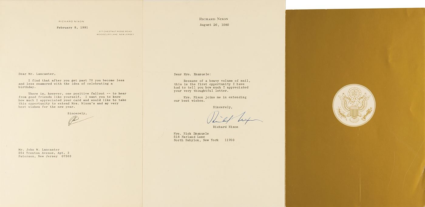 Three items: a TLS signed "Richard Nixon," one page, personal letterhead, August 26, 1980, in part: "Because of a heavy volume of mail, this is the first opportunity I have had to tell you how much I appreciated your very thoughtful letter. Mrs. Nixon joins me in extending our best wishes"; a TLS signed "RN," one page, personal letterhead, February 8, 1991, in part: "I find that after you get past 70 you become less and less enamored with the idea of celebrating a birthday. There is, however one positive fallout—to hear from good friends like yourself. I want you to know how much I appreciated your card and would like to take this opportunity to extend Mrs. Nixon's and my very best wishes for the new year"; and a commemorative card from Nixon's 70th birthday on January 9, 1983, signed inside in felt tip by Nixon. In very good to fine condition, with irregular adhesion to the signature in the card.