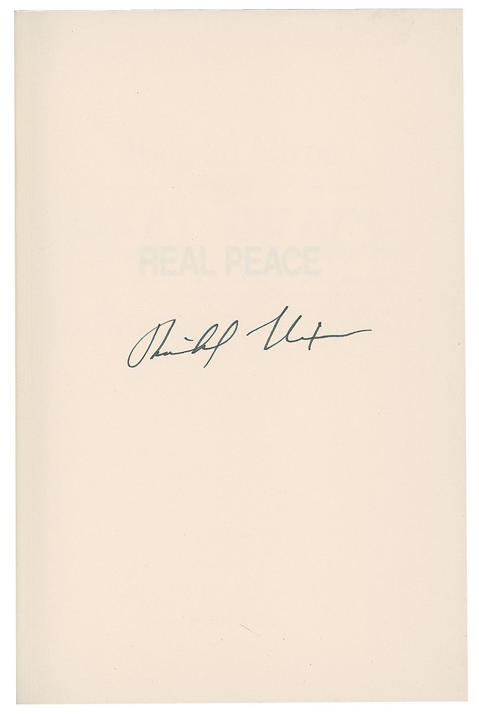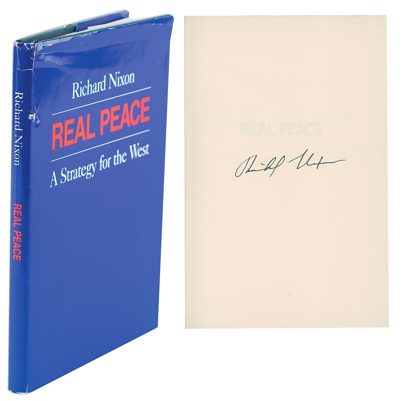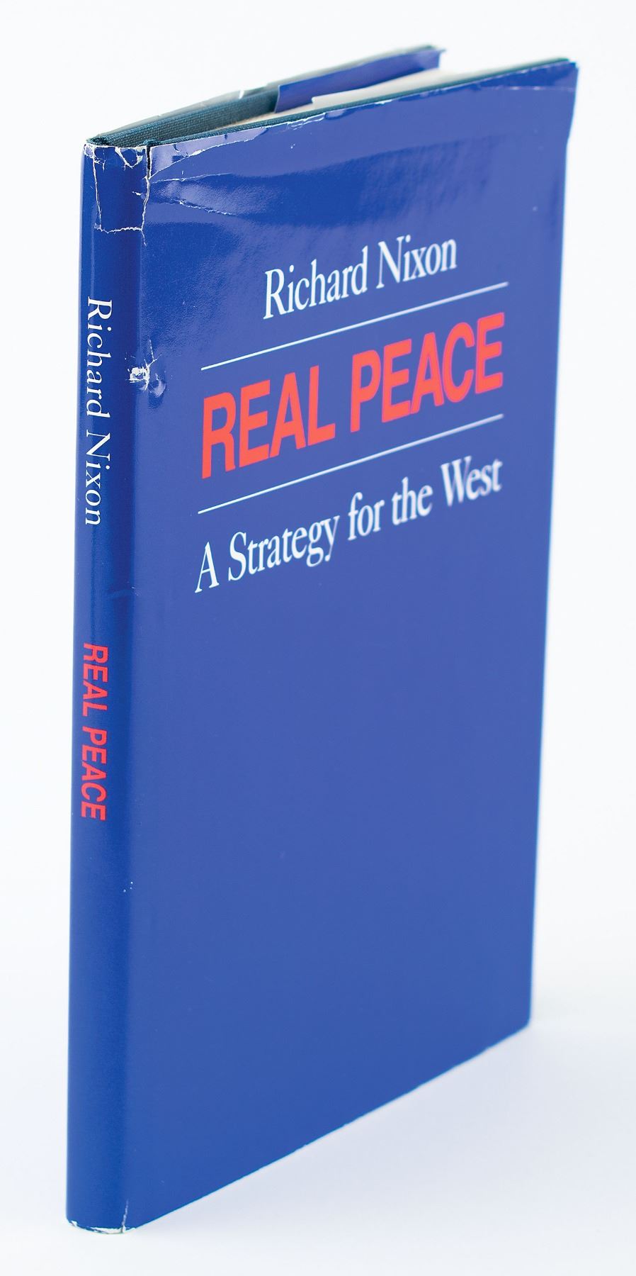 Signed book: Real Peace: A Strategy for the West. First edition, first printing. NY: Privately printed, 1983. Hardcover with dust jacket, 5.75 x 8.5, 106 pages. Signed on the first free end page in blue felt tip by Richard Nixon. In very good to fine condition, with creasing and tears to the dust jacket. Nixon self-published one thousand copies of this book in September 1983, sending them to a 'select group of government officials and opinion leaders'—this particular copy has a laid-in card, bearing a pre-printed facsimile "RN" signature, stating that it is "one of a limited number being sent to the United States' Medal of Honor winners and Vietnam POWs—Americans who have served their country, and the cause of real peace, far beyond the call of duty." The book was later picked up and published in a trade edition by Little, Brown and Company in 1984.