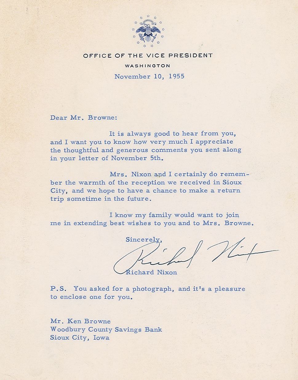 TLS, one page, 7 x 9, Office of the Vice President letterhead, November 10, 1955. Letter to Ken Browne in Sioux City, Iowa, in part: "I want you to know how very much I appreciate the thoughtful and generous comments you sent…Mrs. Nixon and I certainly do remember the warmth of the reception we received in Sioux City, and we hope to have a chance to make a return trip sometime in the future." In fine condition.