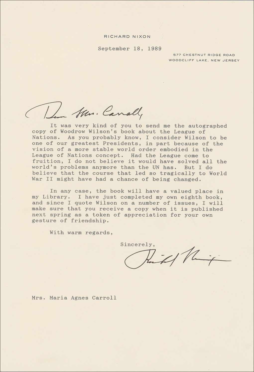TLS, one page, 7.25 x 10.5, personal letterhead, September 18, 1989. Letter to Mrs. Maria Agnes Carroll, with the greeting in Nixon’s hand. In full: “It was very kind of you to send me the autographed copy of Woodrow Wilson’s book about the League of Nations. As you probably know, I consider Wilson to be one of our greatest Presidents, in part because of the vision of a more stable world order embodied in the League of Nations concept. Had the League come to fruition, I do not believe it would have solved all the world’s problems anymore than the UN has. But I do believe that the course that led so tragically to World War II might have had a chance of being changed. In any case, the book will have a valued place in my Library. I have just completed my own eighth book, and since I quote Wilson on a number of issues, I will make sure that you receive a copy when it is published next spring as a token of appreciation for your own gesture of friendship.” In fine condition, with horizontal mailing fold touching the tops of a couple letters of signature.
