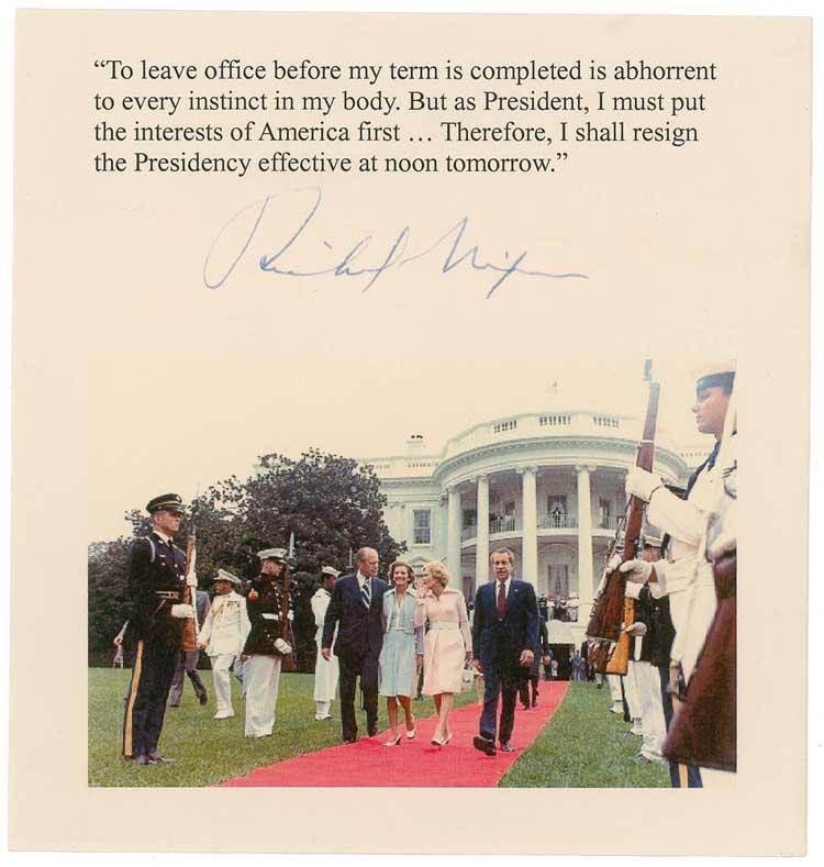 Ink signature, “Richard Nixon,” on an off-white 6 x 6 sheet, to which was later added a quote from President Nixon’s resignation address, which reads, “To leave office before my term is completed is abhorrent to every instinct in my body, but I must put the interests of America first…Therefore, I shall resign the Presidency effective noon tomorrow.” Beneath the signature is a photo reproduction of Nixon leaving the White House for the final time. In very fine condition. Pre-certified John Reznikoff/PSA/DNA and RRAuction COA.