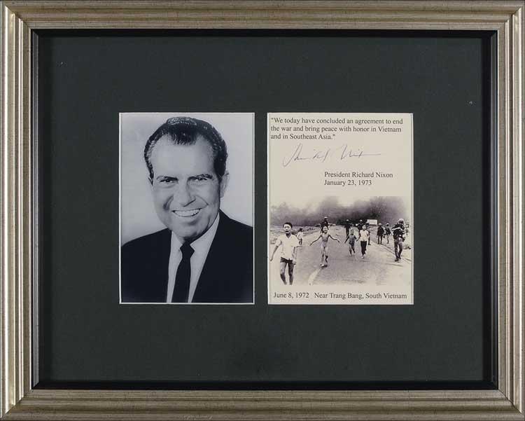 Blue ink signature, “Richard Nixon,” on an off-white 5.5 x 5.5 sheet, to which was later added a quote from President Nixon’s January 23, 1973, address, which reads, “We today have concluded an agreement to end the war and bring peace with honor in Vietnam in Southeast Asia.” Beneath the signature is a photo reproduction of the infamous bombing near Trang Bang in June 1972. Matted and framed with a portrait of Nixon, to an overall size of 14.5 x 11.75. In very fine condition. Pre-certified John Reznikoff/PSA/DNA and RRAuction COA.