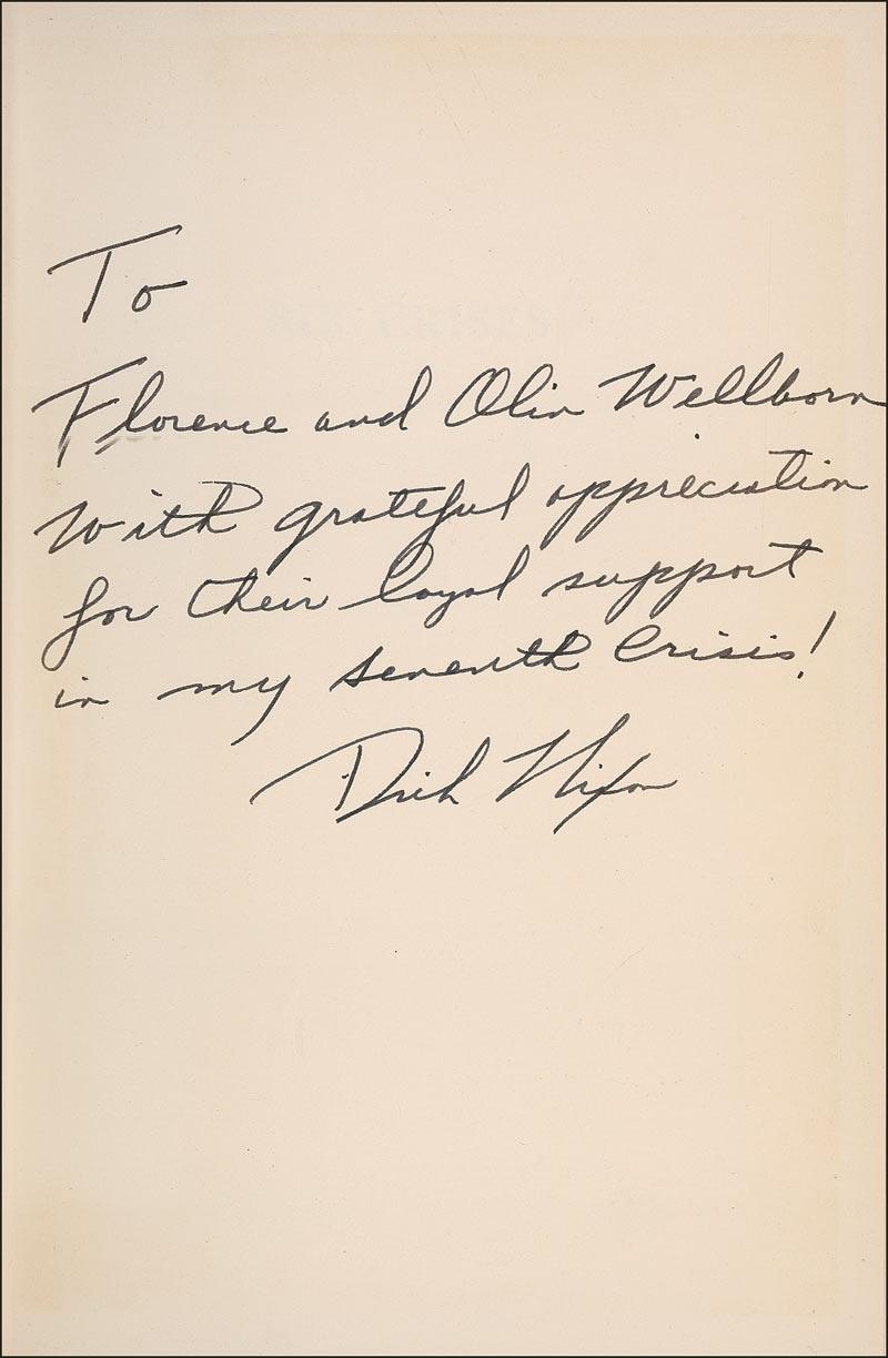 Signed book: Six Crises. Later printing. NY: Doubleday and Company, 1962. Hardcover (lacking dustjacket), 6.5 x 9.5, 459 pages. Signed and inscribed on the first free end page, “To Florence and Olin Wellborn with grateful appreciation for their loyal support in my seventh crisis! Dick Nixon.” Mild perimeter toning to signed page, moderate sunning and damp staining to spine, and some light wear and toning to covers, otherwise fine condition. Pre-certified John Reznikoff/PSA/DNA and RRAuction COA.